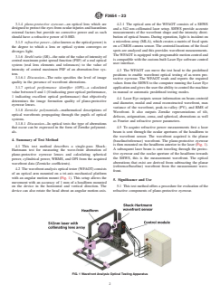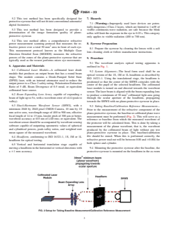 SIGNIFICANCE AND USE 5.1 This test method offers a procedure for evaluation of the refractive components of plano-protective eyewear. 5.2 This test method has been specifically designed for protective eyewear that will not fit into conventional automatic/digital focimeters. 5.3 This test method has been designed to provide a determination of the image formation quality of plano-protective eyewear. 5.4 This test method offers a comprehensive refractive power measurement scanning protocol that measures the refractive power over a total 50 mm2 area in front of each eye. This measurement protocol known as the Multiple Gaze Direction Detailed Scan (MGDDS) measures the refractive powers of the zones of the plano-protective eyewear that are typically used as the wearer performs micro eye movements. SCOPE 1.1 This test method is used to quantify the amount of refractive power (spherical and cylindrical powers) found in planoprotective eyewear. 1.2 This test method is used to quantify the optical performance of plano-protective eyewear as identified by the weighted root mean square average wavefront error. 1.3 This test method may also be used to measure the refractive powers of other plano-protective eyewear or ocular devices, or both. 1.4 Units—The values stated in SI units are to be regarded as standard. No other units of measurement are included in this standard. 1.5 This standard does not purport to address all of the safety concerns, if any, associated with its use. It is the responsibility of the user of this standard to establish appropriate safety, health, and environmental practices and determine the applicability of regulatory limitations prior to use. 1.6 This international standard was developed in accordance with internationally recognized principles on standardization established in the Decision on Principles for the Development of International Standards, Guides and Recommendations issued by the World Trade Organization Technical Barriers to Trade (TBT) Committee.