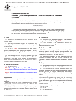 ASTM E2812-17 is a standard published by ASTM International. Its full title is "Standard Practice for Uniform Data Management in Asset Management Records Systems". This standard covers: SIGNIFICANCE AND USE 4.1 Uniform asset management data is intended to provide a means of enabling accurate summary level information and reports to improve operational and strategic management capabilities at all phases of the asset lifecycle. 4.2 Entities should manage the asset management records system in accordance with this practice to maintain data consistency, integrity, and usability and thus achieve uniform data. SCOPE 1.1 This practice is intended to be used for records of all types of assets. 1.2 This practice provides guidance on establishing and maintaining uniform asset data within an asset management records system. 1.3 See ASTM E2604, Standard Practice for Data Characteristics of Equipment Asset Record, for mandatory and optional data characteristics required in the creation of an asset record. 1.4 This standard does not purport to address all of the safety concerns, if any, associated with its use. It is the responsibility of the user of this standard to establish appropriate safety and health practices and determine the applicability of regulatory limitations prior to use.