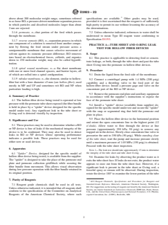 SIGNIFICANCE AND USE 5.1 These practices may be used to determine whether a RO or NF device is free of leaks if the mechanical integrity of the device is to be confirmed. They may also be used to detect leaks in RO or NF devices whose operating performance indicates a possible leak. These practices may be used for either new or used devices. SCOPE 1.1 These practices cover detecting leaks in which there is a direct communication between the feed or concentrate, or both, and the permeate. Several types of leaks are possible with the various configurations of reverse-osmosis (RO) and nanofiltration (NF) devices. 1.2 Types of Leaks: 1.2.1 With hollow-fiber devices, feed or concentrate leakage, or both, into the permeate stream by leaks through the tube sheet and past the tube sheet O-ring are possible. “Leaks” caused by broken fibers are not covered by these practices. 1.2.2 With spiral-wound devices, leaks may occur through damage of the membrane surface itself by punctures or scratches, by glue-line failure, and by O-ring leaks on product tube interconnectors. 1.2.3 With tubular devices, leaks due to membrane damage, tube end seal leaks, and leaks from broken tubes or product headers are possible. 1.3 Three leak test practices are given as follows: Sections Practice A—Tube Sheet and O-Ring Leak Test for Hollow Fiber Devices 8 to 9 Practice B—Vacuum Test for Spiral Wound Devices 10 to 12 Practice C—Dye Test for Spiral Wound and Tubular Devices 13 to 18 1.4 The values stated in SI units are to be regarded as standard. No other units of measurement are included in this standard. 1.5 This standard does not purport to address all of the safety concerns, if any, associated with its use. It is the responsibility of the user of this standard to establish appropriate safety, health, and environmental practices and determine the applicability of regulatory limitations prior to use. 1.6 This international standard was developed in accordance with internationally recognized principles on standardization established in the Decision on Principles for the Development of International Standards, Guides and Recommendations issued by the World Trade Organization Technical Barriers to Trade (TBT) Committee.