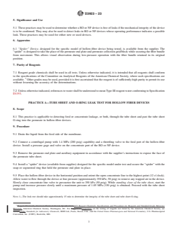 ASTM D3923-23 is a standard published by ASTM International. Its full title is "Standard Practices for Detecting Leaks in Reverse Osmosis and Nanofiltration Devices". This standard covers: SIGNIFICANCE AND USE 5.1 These practices may be used to determine whether a RO or NF device is free of leaks if the mechanical integrity of the device is to be confirmed. They may also be used to detect leaks in RO or NF devices whose operating performance indicates a possible leak. These practices may be used for either new or used devices. SCOPE 1.1 These practices cover detecting leaks in which there is a direct communication between the feed or concentrate, or both, and the permeate. Several types of leaks are possible with the various configurations of reverse-osmosis (RO) and nanofiltration (NF) devices. 1.2 Types of Leaks: 1.2.1 With hollow-fiber devices, feed or concentrate leakage, or both, into the permeate stream by leaks through the tube sheet and past the tube sheet O-ring are possible. “Leaks” caused by broken fibers are not covered by these practices. 1.2.2 With spiral-wound devices, leaks may occur through damage of the membrane surface itself by punctures or scratches, by glue-line failure, and by O-ring leaks on product tube interconnectors. 1.2.3 With tubular devices, leaks due to membrane damage, tube end seal leaks, and leaks from broken tubes or product headers are possible. 1.3 Three leak test practices are given as follows: Sections Practice A—Tube Sheet and O-Ring Leak Test for Hollow Fiber Devices 8 to 9 Practice B—Vacuum Test for Spiral Wound Devices 10 to 12 Practice C—Dye Test for Spiral Wound and Tubular Devices 13 to 18 1.4 The values stated in SI units are to be regarded as standard. No other units of measurement are included in this standard. 1.5 This standard does not purport to address all of the safety concerns, if any, associated with its use. It is the responsibility of the user of this standard to establish appropriate safety, health, and environmental practices and determine the applicability of regulatory limitations prior to use. 1.6 This international standard was developed in accordance with internationally recognized principles on standardization established in the Decision on Principles for the Development of International Standards, Guides and Recommendations issued by the World Trade Organization Technical Barriers to Trade (TBT) Committee.