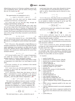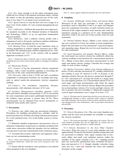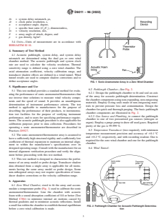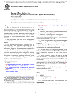 ASTM D6011-96(2022) is a standard published by ASTM International. Its full title is "Standard Test Method for Determining the Performance of a Sonic Anemometer/Thermometer". This standard covers: SIGNIFICANCE AND USE 5.1 This test method provides a standard method for evaluating the performance of sonic anemometer/thermometers that use inverse time solutions to measure wind velocity components and the speed of sound. It provides an unambiguous determination of instrument performance criteria. The test method is applicable to manufacturers for the purpose of describing the performance of their products, to instrumentation test facilities for the purpose of verifying instrument performance, and to users for specifying performance requirements. The acoustic pathlength procedure is also applicable for calibration purposes prior to data collection. Procedures for operating a sonic anemometer/thermometer are described in Practices D5527. 5.2 The sonic anemometer/thermometer array is assumed to have a sufficiently high structural rigidity and a sufficiently low coefficient of thermal expansion to maintain an internal alignment to within the manufacturer's specifications over its designed operating range. Consult with the manufacturer for an internal alignment verification procedure and verify the alignment before proceeding with this test method. 5.3 This test method is designed to characterize the performance of an array model or probe design. Transducer shadow data obtained from a single array is applicable for all instruments having the same array model or probe design. Some non-orthogonal arrays may not require specification of transducer shadow corrections or the velocity calibration range. SCOPE 1.1 This test method covers the determination of the dynamic performance of a sonic anemometer/thermometer which employs the inverse time measurement technique for velocity or speed of sound, or both. Performance criteria include: (a) acceptance angle, (b) acoustic pathlength, (c) system delay, (d) system delay mismatch, (e) thermal stability range, (f) shadow correction, (g) velocity calibration range, and (h) velocity resolution. 1.2 The values stated in SI units are to be regarded as standard. No other units of measurement are included in this standard. 1.3 This standard does not purport to address all of the safety concerns, if any, associated with its use. It is the responsibility of the user of this standard to establish appropriate safety, health, and environmental practices and determine the applicability of regulatory limitations prior to use. 1.4 This international standard was developed in accordance with internationally recognized principles on standardization established in the Decision on Principles for the Development of International Standards, Guides and Recommendations issued by the World Trade Organization Technical Barriers to Trade (TBT) Committee.