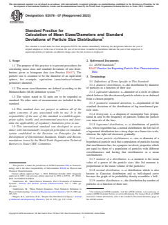 ASTM E2578-07(2022) is a standard published by ASTM International. Its full title is "Standard Practice for Calculation of Mean Sizes/Diameters and Standard Deviations of Particle Size Distributions". This standard covers: SIGNIFICANCE AND USE 5.1 Mean particle diameters defined according to the Moment-Ratio (M-R) system are derived from ratios between two moments of a particle size distribution. SCOPE 1.1 The purpose of this practice is to present procedures for calculating mean sizes and standard deviations of size distributions given as histogram data (see Practice E1617). The particle size is assumed to be the diameter of an equivalent sphere, for example, equivalent (area/surface/volume/perimeter) diameter. 1.2 The mean sizes/diameters are defined according to the Moment-Ratio (M-R) definition system.2,3,4 1.3 The values stated in SI units are to be regarded as standard. No other units of measurement are included in this standard. 1.4 This standard does not purport to address all of the safety concerns, if any, associated with its use. It is the responsibility of the user of this standard to establish appropriate safety, health, and environmental practices and determine the applicability of regulatory limitations prior to use. 1.5 This international standard was developed in accordance with internationally recognized principles on standardization established in the Decision on Principles for the Development of International Standards, Guides and Recommendations issued by the World Trade Organization Technical Barriers to Trade (TBT) Committee.