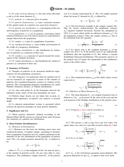 SIGNIFICANCE AND USE 5.1 Mean particle diameters defined according to the Moment-Ratio (M-R) system are derived from ratios between two moments of a particle size distribution. SCOPE 1.1 The purpose of this practice is to present procedures for calculating mean sizes and standard deviations of size distributions given as histogram data (see Practice E1617). The particle size is assumed to be the diameter of an equivalent sphere, for example, equivalent (area/surface/volume/perimeter) diameter. 1.2 The mean sizes/diameters are defined according to the Moment-Ratio (M-R) definition system.2,3,4 1.3 The values stated in SI units are to be regarded as standard. No other units of measurement are included in this standard. 1.4 This standard does not purport to address all of the safety concerns, if any, associated with its use. It is the responsibility of the user of this standard to establish appropriate safety, health, and environmental practices and determine the applicability of regulatory limitations prior to use. 1.5 This international standard was developed in accordance with internationally recognized principles on standardization established in the Decision on Principles for the Development of International Standards, Guides and Recommendations issued by the World Trade Organization Technical Barriers to Trade (TBT) Committee.