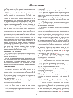 The standard describes seven recognized methods for well purging and outlines key factors influencing method selection, such as hydrogeologic setting, well condition, potential contaminants, and well yield. It advises users to apply professional judgment and consider site-specific circumstances, regulatory requirements, and the objectives of the sampling and analysis plan.