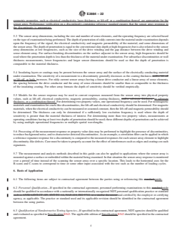 ASTM E2884-22 is a guide published by ASTM International. Its full title is "Standard Guide for Eddy Current Testing of Electrically Conducting Materials Using Conformable Sensor Arrays". This standard covers: SIGNIFICANCE AND USE 5.1 Eddy current methods are used for nondestructively locating and characterizing discontinuities and geometric property variations in magnetic or nonmagnetic electrically conducting materials. Conformable eddy current sensor arrays permit examination of planar and non-planar materials but usually require suitable fixtures to hold the sensor array near the surface of the material of interest, such as a layer of foam behind the sensor array along with a rigid support structure. 5.2 In operation, the sensor arrays are standardized with measurements in air or a reference part, or both. Responses measured from the sensor array may be converted into physical property values, such as lift-off, electrical conductivity, or magnetic permeability, or a combination thereof. Proper instrument operation is verified by ensuring that these measurement responses or property values are within a prescribed range. Performance verification is performed periodically. Performance verification on a discontinuity-free reference standard or regions of the material being examined that do not contain discontinuities ensures that the electrical and geometric properties, such as electrical conductivity, layer thickness, or lift-off, or a combination thereof, are appropriate for the sensor array. Performance verification on a discontinuity-containing reference standard ensures that the sensor array response to the discontinuity is appropriate. 5.3 The sensor array dimensions, including the size and number of sense elements, and the operating frequency are selected based on the type of examination being performed. The depth of penetration of eddy currents into the material under examination depends upon the frequency of the signal, the electrical conductivity and magnetic permeability of the material, and some dimensions of the sensor array. The depth of penetration is equal to the conventional skin depth at high frequencies but is also related to the sensor array dimensions at low frequen... SCOPE 1.1 This guide covers the use of conformable eddy current sensor arrays for nondestructive examination of electrically conducting materials for discontinuities and material quality. The discontinuities include surface breaking and subsurface cracks and pitting as well as near-surface and hidden-surface material loss. The material quality includes coating or layer thickness, electrical conductivity, magnetic permeability, surface roughness, and other properties that vary with the electrical conductivity or magnetic permeability. 1.2 This guide is intended for use on nonmagnetic and magnetic metals as well as composite materials with an electrically conducting component, such as reinforced carbon-carbon composite or polymer matrix composites with carbon fibers. 1.3 This guide applies to planar as well as non-planar materials with and without insulating coating layers. 1.4 Units—The values stated in SI units are to be regarded as standard. The values given in parentheses are mathematical conversions to inch-pound units that are provided for information only and are not considered standard. 1.5 This standard does not purport to address all of the safety concerns, if any, associated with its use. It is the responsibility of the user of this standard to establish appropriate safety, health, and environmental practices and determine the applicability of regulatory limitations prior to use. 1.6 This international standard was developed in accordance with internationally recognized principles on standardization established in the Decision on Principles for the Development of International Standards, Guides and Recommendations issued by the World Trade Organization Technical Barriers to Trade (TBT) Committee.