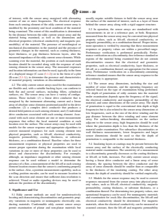 SIGNIFICANCE AND USE 5.1 Eddy current methods are used for nondestructively locating and characterizing discontinuities and geometric property variations in magnetic or nonmagnetic electrically conducting materials. Conformable eddy current sensor arrays permit examination of planar and non-planar materials but usually require suitable fixtures to hold the sensor array near the surface of the material of interest, such as a layer of foam behind the sensor array along with a rigid support structure. 5.2 In operation, the sensor arrays are standardized with measurements in air or a reference part, or both. Responses measured from the sensor array may be converted into physical property values, such as lift-off, electrical conductivity, or magnetic permeability, or a combination thereof. Proper instrument operation is verified by ensuring that these measurement responses or property values are within a prescribed range. Performance verification is performed periodically. Performance verification on a discontinuity-free reference standard or regions of the material being examined that do not contain discontinuities ensures that the electrical and geometric properties, such as electrical conductivity, layer thickness, or lift-off, or a combination thereof, are appropriate for the sensor array. Performance verification on a discontinuity-containing reference standard ensures that the sensor array response to the discontinuity is appropriate. 5.3 The sensor array dimensions, including the size and number of sense elements, and the operating frequency are selected based on the type of examination being performed. The depth of penetration of eddy currents into the material under examination depends upon the frequency of the signal, the electrical conductivity and magnetic permeability of the material, and some dimensions of the sensor array. The depth of penetration is equal to the conventional skin depth at high frequencies but is also related to the sensor array dimensions at low frequen... SCOPE 1.1 This guide covers the use of conformable eddy current sensor arrays for nondestructive examination of electrically conducting materials for discontinuities and material quality. The discontinuities include surface breaking and subsurface cracks and pitting as well as near-surface and hidden-surface material loss. The material quality includes coating or layer thickness, electrical conductivity, magnetic permeability, surface roughness, and other properties that vary with the electrical conductivity or magnetic permeability. 1.2 This guide is intended for use on nonmagnetic and magnetic metals as well as composite materials with an electrically conducting component, such as reinforced carbon-carbon composite or polymer matrix composites with carbon fibers. 1.3 This guide applies to planar as well as non-planar materials with and without insulating coating layers. 1.4 Units—The values stated in SI units are to be regarded as standard. The values given in parentheses are mathematical conversions to inch-pound units that are provided for information only and are not considered standard. 1.5 This standard does not purport to address all of the safety concerns, if any, associated with its use. It is the responsibility of the user of this standard to establish appropriate safety, health, and environmental practices and determine the applicability of regulatory limitations prior to use. 1.6 This international standard was developed in accordance with internationally recognized principles on standardization established in the Decision on Principles for the Development of International Standards, Guides and Recommendations issued by the World Trade Organization Technical Barriers to Trade (TBT) Committee.