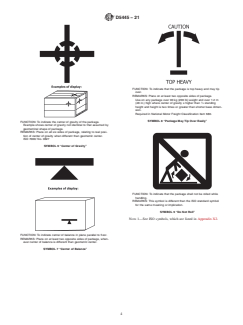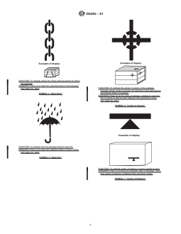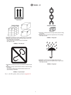 SIGNIFICANCE AND USE 4.1 Packages are often marked with handling instructions in the language of the country of origin. While this may safeguard the consignment to some extent, it is of little value for goods consigned to, or through, countries using different languages, and of no value at all if people unloading the packages are illiterate. Pictorial symbols offer the most likely means of conveying the consignor’s intention and their adoption will, therefore, undoubtedly reduce loss and damage through incorrect handling. The use of pictorial symbols does not provide any guarantee of satisfactory handling; proper protective packaging is therefore of primary importance. SCOPE 1.1 This practice establishes a set of symbols to be used for marking of packages or containers to indicate special handling and storage requirements. 1.2 The values stated in SI units are to be regarded as standard. The values given in parentheses after SI units are provided for information only and are not considered standard. 1.3 This standard does not purport to address all of the safety concerns, if any, associated with its use. It is the responsibility of the user of this standard to establish appropriate safety, health, and environmental practices and determine the applicability of regulatory limitations prior to use. 1.4 This international standard was developed in accordance with internationally recognized principles on standardization established in the Decision on Principles for the Development of International Standards, Guides and Recommendations issued by the World Trade Organization Technical Barriers to Trade (TBT) Committee.