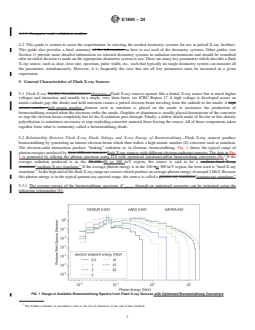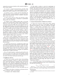 SIGNIFICANCE AND USE 4.1 Flash X-ray facilities provide intense bremsstrahlung radiation environments, usually in a single sub-microsecond pulse, which often fluctuates in amplitude, shape, and spectrum from shot to shot. Therefore, appropriate dosimetry must be fielded on every exposure to characterize the environment, see ICRU Report 34. These intense bremsstrahlung sources have a variety of applications which include the following: (1) Studies of the effects of X-rays and gamma rays on materials. (2) Studies of the effects of radiation on electronic devices such as transistors, diodes, and capacitors. (3) Computer code validation studies. 4.2 This guide is written to assist the experimenter in selecting the needed dosimetry systems for use at pulsed X-ray facilities. This guide also provides a brief summary on how to use each of the dosimetry systems. Other guides (see Section 2) provide more detailed information on selected dosimetry systems in radiation environments and should be consulted after an initial decision is made on the appropriate dosimetry system to use. There are many key parameters which describe a flash X-ray source, such as dose, dose rate, spectrum, pulse width, etc., such that typically no single dosimetry system can measure all the parameters simultaneously. However, it is frequently the case that not all key parameters must be measured in a given experiment. SCOPE 1.1 This guide provides assistance in selecting and using dosimetry systems in flash X-ray experiments. Both dose and dose rate techniques are described. 1.2 Operating characteristics of flash X-ray sources are given, with emphasis on the spectrum of the photon output. 1.3 Assistance is provided to relate the measured dose to the response of a device under test (DUT). The device is assumed to be a semiconductor electronic part or system. 1.4 This international standard was developed in accordance with internationally recognized principles on standardization established in the Decision on Principles for the Development of International Standards, Guides and Recommendations issued by the World Trade Organization Technical Barriers to Trade (TBT) Committee.