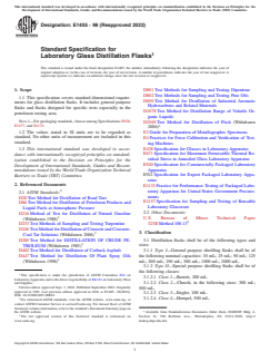 ASTM E1405-98(2022) is a technical specification published by ASTM International. Its full title is "Standard Specification for Laboratory Glass Distillation Flasks". This standard covers: ABSTRACT This specification covers standard dimensional requirements for glass distillation flasks. It includes general purpose flasks and flasks designed for specific tests especially in the petroleum testing area. Distillation flasks shall be of the following types: Type I and Type II. Type II distilling flasks shall be of the following classes: Class 1; Class 2; Class 3; Class 4; and Class 5. SCOPE 1.1 This specification covers standard dimensional requirements for glass distillation flasks. It includes general purpose flasks and flasks designed for specific tests especially in the petroleum testing area. Note 1: For packaging standards, choose among Specifications E920, E1157, and E1133. 1.2 The values stated in SI units are to be regarded as standard. No other units of measurement are included in this standard. 1.3 This international standard was developed in accordance with internationally recognized principles on standardization established in the Decision on Principles for the Development of International Standards, Guides and Recommendations issued by the World Trade Organization Technical Barriers to Trade (TBT) Committee.