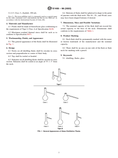 ABSTRACT This specification covers standard dimensional requirements for glass distillation flasks. It includes general purpose flasks and flasks designed for specific tests especially in the petroleum testing area. Distillation flasks shall be of the following types: Type I and Type II. Type II distilling flasks shall be of the following classes: Class 1; Class 2; Class 3; Class 4; and Class 5. SCOPE 1.1 This specification covers standard dimensional requirements for glass distillation flasks. It includes general purpose flasks and flasks designed for specific tests especially in the petroleum testing area. Note 1: For packaging standards, choose among Specifications E920, E1157, and E1133. 1.2 The values stated in SI units are to be regarded as standard. No other units of measurement are included in this standard. 1.3 This international standard was developed in accordance with internationally recognized principles on standardization established in the Decision on Principles for the Development of International Standards, Guides and Recommendations issued by the World Trade Organization Technical Barriers to Trade (TBT) Committee.