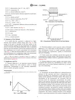 SIGNIFICANCE AND USE 5.1 Thermal diffusivity is an important transient thermal property, required for such purposes such as design applications, determination of safe operating temperature, process control, and quality assurance. 5.2 The flash method is used to measure values of thermal diffusivity, α, of a wide range of solid materials. It is particularly advantageous because of simple specimen geometry, small specimen size requirements, rapidity of measurement and ease of handling. 5.3 Under certain strict conditions, specific heat capacity of a homogeneous isotropic opaque solid specimen can be determined when the method is used in a quantitative fashion (see Appendix X2). 5.4 Thermal diffusivity results, together with related values of specific heat capacity (Cp) and density (ρ) values, can be used in many cases to derive thermal conductivity (λ), according to the relationship: SCOPE 1.1 This test method covers the determination of the thermal diffusivity of primarily homogeneous isotropic solid materials. Thermal diffusivity values ranging from 0.1 to 1000 (mm)2 s-1 are measurable by this test method from about 75 to 2800 K. 1.2 Practice E2585 is adjunct to this test method and contains detailed information regarding the use of the flash method. The two documents are complementing each other. 1.3 This test method is a more detailed form of Test Method C714, having applicability to much wider ranges of materials, applications, and temperatures, with improved accuracy of measurements. 1.4 This test method is intended to allow a wide variety of apparatus designs. It is not practical in a test method of this type to establish details of construction and procedures to cover all contingencies that might offer difficulties to a person without pertinent technical knowledge, or to restrict research and development for improvements in the basic technique. 1.5 This test method is applicable to the measurements performed on essentially fully dense (preferably, but low porosity would be acceptable), homogeneous, and isotropic solid materials that are opaque to the applied energy pulse. Experience shows that some deviation from these strict guidelines can be accommodated with care and proper experimental design, substantially broadening the usefulness of the method. 1.6 The values stated in SI units are to be regarded as standard. No other units of measurement are included in this standard. 1.7 For systems employing lasers as power sources, it is imperative that the safety requirement be fully met. 1.8 This standard does not purport to address all of the safety concerns, if any, associated with its use. It is the responsibility of the user of this standard to establish appropriate safety, health, and environmental practices and determine the applicability of regulatory limitations prior to use. 1.9 This international standard was developed in accordance with internationally recognized principles on standardization established in the Decision on Principles for the Development of International Standards, Guides and Recommendations issued by the World Trade Organization Technical Barriers to Trade (TBT) Committee.