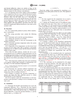 ASTM E1461-13(2022) is a standard published by ASTM International. Its full title is "Standard Test Method for Thermal Diffusivity by the Flash Method". This standard covers: SIGNIFICANCE AND USE 5.1 Thermal diffusivity is an important transient thermal property, required for such purposes such as design applications, determination of safe operating temperature, process control, and quality assurance. 5.2 The flash method is used to measure values of thermal diffusivity, α, of a wide range of solid materials. It is particularly advantageous because of simple specimen geometry, small specimen size requirements, rapidity of measurement and ease of handling. 5.3 Under certain strict conditions, specific heat capacity of a homogeneous isotropic opaque solid specimen can be determined when the method is used in a quantitative fashion (see Appendix X2). 5.4 Thermal diffusivity results, together with related values of specific heat capacity (Cp) and density (ρ) values, can be used in many cases to derive thermal conductivity (λ), according to the relationship: SCOPE 1.1 This test method covers the determination of the thermal diffusivity of primarily homogeneous isotropic solid materials. Thermal diffusivity values ranging from 0.1 to 1000 (mm)2 s-1 are measurable by this test method from about 75 to 2800 K. 1.2 Practice E2585 is adjunct to this test method and contains detailed information regarding the use of the flash method. The two documents are complementing each other. 1.3 This test method is a more detailed form of Test Method C714, having applicability to much wider ranges of materials, applications, and temperatures, with improved accuracy of measurements. 1.4 This test method is intended to allow a wide variety of apparatus designs. It is not practical in a test method of this type to establish details of construction and procedures to cover all contingencies that might offer difficulties to a person without pertinent technical knowledge, or to restrict research and development for improvements in the basic technique. 1.5 This test method is applicable to the measurements performed on essentially fully dense (preferably, but low porosity would be acceptable), homogeneous, and isotropic solid materials that are opaque to the applied energy pulse. Experience shows that some deviation from these strict guidelines can be accommodated with care and proper experimental design, substantially broadening the usefulness of the method. 1.6 The values stated in SI units are to be regarded as standard. No other units of measurement are included in this standard. 1.7 For systems employing lasers as power sources, it is imperative that the safety requirement be fully met. 1.8 This standard does not purport to address all of the safety concerns, if any, associated with its use. It is the responsibility of the user of this standard to establish appropriate safety, health, and environmental practices and determine the applicability of regulatory limitations prior to use. 1.9 This international standard was developed in accordance with internationally recognized principles on standardization established in the Decision on Principles for the Development of International Standards, Guides and Recommendations issued by the World Trade Organization Technical Barriers to Trade (TBT) Committee.