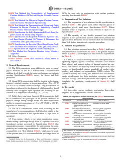 ASTM D5752-10(2017) is a technical specification published by ASTM International. Its full title is "Standard Specification for Supplemental Coolant Additives (SCAs) for Use in Precharging Coolants for Heavy-Duty Engines". This standard covers: ABSTRACT This specification covers the general, physical, chemical, and performance requirements for supplemental coolant additives for use as precharging coolants in the cooling systems of heavy-duty engines. Test solutions shall be standard corrosive water, ethylene or propylene glycol in standard corrosive water, and NaCl dissolved in a solution of glycol in deionized water. These test solutions shall comply to the specific limits for the following requirements: corrosion in glassware mass loss; simulated service test mass loss; foaming; water pump cavitation erosion-corrosion rating; corrosion of cast aluminum alloys at heat-rejecting surfaces; ultrasonic cavitation resistance; supplemental coolant additive-glycol base coolant compatibility; hot surface scaling and deposits resistance; effect on nonmetals; storage stability; ash, chloride ion, and silicon contents; pH in distilled water; reserve alkalinity; and the effect on vehicle finish. SCOPE 1.1 This specification covers the general, physical, chemical, and performance requirements for Supplemental Coolant Additives (SCAs) at a precharged level in the cooling systems of heavy-duty engines. Note 1: After precharging, SCAs are customarily used periodically to service cooling systems at 1/4 to 1/3 the precharged dosage to compensate for additives lost through dilution and depletion. 1.2 The SCA products meeting this specification are intended for use with water, with recommended dilutions of coolant concentrates, with prediluted engine coolants, or to upgrade the performance of light-duty engine coolants to meet the heav-duty requirements of Specification D6210. Engine coolant products shall be of the low-silicate type and, if ethylene glycol based, shall meet Specification D4985. Propylene glycol base low-silicate type coolant products may also be used, if these materials meet the chemical and performance requirements of Specification D4985. 1.3 The SCA concentrate, before dissolution, may be in either liquid, solid, or slurry form. The form is as agreed upon between the manufacturer and the user. 1.4 The values stated in SI units are to be regarded as standard. The inch-pound units in parentheses are approximate equivalents provided for information only. 1.5 This standard does not purport to address all of the safety concerns, if any, associated with its use. It is the responsibility of the user of this standard to establish appropriate safety and health practices and determine the applicability of regulatory limitations prior to use. 1.6 This international standard was developed in accordance with internationally recognized principles on standardization established in the Decision on Principles for the Development of International Standards, Guides and Recommendations issued by the World Trade Organization Technical Barriers to Trade (TBT) Committee.