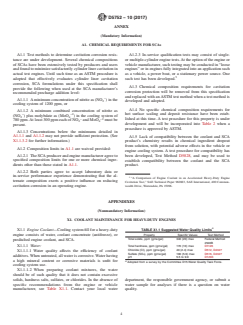 ABSTRACT This specification covers the general, physical, chemical, and performance requirements for supplemental coolant additives for use as precharging coolants in the cooling systems of heavy-duty engines. Test solutions shall be standard corrosive water, ethylene or propylene glycol in standard corrosive water, and NaCl dissolved in a solution of glycol in deionized water. These test solutions shall comply to the specific limits for the following requirements: corrosion in glassware mass loss; simulated service test mass loss; foaming; water pump cavitation erosion-corrosion rating; corrosion of cast aluminum alloys at heat-rejecting surfaces; ultrasonic cavitation resistance; supplemental coolant additive-glycol base coolant compatibility; hot surface scaling and deposits resistance; effect on nonmetals; storage stability; ash, chloride ion, and silicon contents; pH in distilled water; reserve alkalinity; and the effect on vehicle finish. SCOPE 1.1 This specification covers the general, physical, chemical, and performance requirements for Supplemental Coolant Additives (SCAs) at a precharged level in the cooling systems of heavy-duty engines. Note 1: After precharging, SCAs are customarily used periodically to service cooling systems at 1/4 to 1/3 the precharged dosage to compensate for additives lost through dilution and depletion. 1.2 The SCA products meeting this specification are intended for use with water, with recommended dilutions of coolant concentrates, with prediluted engine coolants, or to upgrade the performance of light-duty engine coolants to meet the heav-duty requirements of Specification D6210. Engine coolant products shall be of the low-silicate type and, if ethylene glycol based, shall meet Specification D4985. Propylene glycol base low-silicate type coolant products may also be used, if these materials meet the chemical and performance requirements of Specification D4985. 1.3 The SCA concentrate, before dissolution, may be in either liquid, solid, or slurry form. The form is as agreed upon between the manufacturer and the user. 1.4 The values stated in SI units are to be regarded as standard. The inch-pound units in parentheses are approximate equivalents provided for information only. 1.5 This standard does not purport to address all of the safety concerns, if any, associated with its use. It is the responsibility of the user of this standard to establish appropriate safety and health practices and determine the applicability of regulatory limitations prior to use. 1.6 This international standard was developed in accordance with internationally recognized principles on standardization established in the Decision on Principles for the Development of International Standards, Guides and Recommendations issued by the World Trade Organization Technical Barriers to Trade (TBT) Committee.
