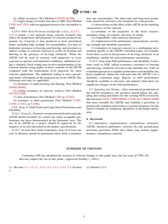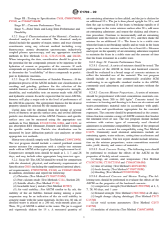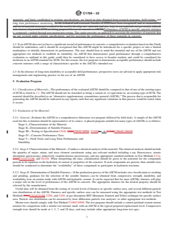 SIGNIFICANCE AND USE 4.1 Supplementary cementitious materials (SCM) covered under existing ASTM specifications are fly ash, slag cement, raw and calcined natural pozzolans including calcined clays, silica fume, and ground-glass pozzolan. The use of these materials, and limits established in existing specifications, are based on data obtained from research programs, field testing, and long term performance monitoring. Performance of SCM in specific concrete mixtures is commonly verified through preconstruction testing. This guide provides an approach to assessing the properties of materials that are not covered under existing specifications, and for assessing the performance of those materials in concrete. 4.2 If an ASCM does not yet have a significant record of performance in concrete, a comprehensive evaluation based on this Guide should be undertaken, and it should be recognized that this ASCM might be introduced for a specific project or into a limited marketplace to initially demonstrate its performance. The user should bear in mind the intended end use of the ASCM and use appropriate test methods to establish its suitability. An ASCM that demonstrates good performance through a comprehensive evaluation as outlined in this guide could then be considered to have access to broader markets and could be considered for inclusion in an ASTM standard for SCM. For this reason, the test program to demonstrate acceptable performance should include concrete mixtures with a range of characteristics specific to the ASCM’s intended use. 4.3 In the absence of long-term durability or acceptable field performance, prospective users are advised to apply appropriate risk management and engineering practice in the use of an ASCM. SCOPE 1.1 This guide is intended to provide a technical approach to the evaluation of alternative supplementary cementitious materials such as pozzolans and hydraulic materials that fall outside the scope of Specifications C618, C989/C989M, C1240, and C1866/C1866M. This guide provides the initial steps for a comprehensive evaluation of an ASCM that provides due diligence for its specific intended uses in concrete; however, it does not evaluate conformance to all possible performance criteria for all types of concrete mixtures. 1.2 The values stated in SI units are to be regarded as standard. No other units of measurement are included in this standard. 1.3 Performing the tests or meeting the test limits in this guide should not imply that the material tested meets the requirements of Specifications C618, C989/C989M, C1240, and C1866/C1866M. These materials should not be represented as such and each specific source is to be evaluated separately. 1.4 This standard does not purport to address all of the safety concerns, if any, associated with its use. It is the responsibility of the user of this standard to establish appropriate safety, health, and environmental practices and determine the applicability of regulatory limitations prior to use. 1.5 This international standard was developed in accordance with internationally recognized principles on standardization established in the Decision on Principles for the Development of International Standards, Guides and Recommendations issued by the World Trade Organization Technical Barriers to Trade (TBT) Committee.