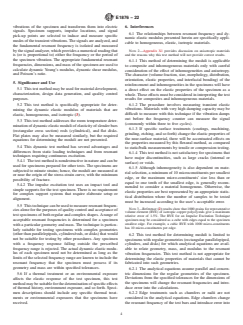 5.5 This technique can be used to measure resonant frequencies alone for the purposes of quality control and acceptance of test specimens of both regular and complex shapes. A range of acceptable resonant frequencies is determined for a specimen with a particular geometry and mass. The technique is particularly suitable for testing specimens with complex geometries (other than parallelepipeds, cylinders/rods, or disks) that would not be suitable for testing by other procedures. Any specimen with a frequency response falling outside the prescribed frequency range is rejected. The actual dynamic elastic modulus of each specimen need not be determined as long as the limits of the selected frequency range are known to include the resonant frequency that the...
