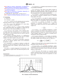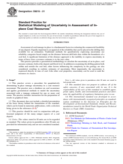 ASTM D8215-21 is a standard published by ASTM International. Its full title is "Standard Practice for Statistical Modeling of Uncertainty in Assessment of In-place Coal Resources". This standard covers: SIGNIFICANCE AND USE 5.1 Traditional methods for expressing geological uncertainty consist of preparing reliability categories based simply on the distance between drill hole data points, such as the one described by Wood et al. (5) that uses only the drill holes within the coal bed. A major drawback of distance methods is their weak to null association with estimation errors. This practice provides a methodology for effectively assessing the uncertainty in coal resource estimates utilizing stochastic simulation. In determining uncertainty for any coal assessment, stochastic simulation enables consideration of other important factors and information beyond the geometry of drill hole locations, both in and out of the coal bed, including: non-depositional channels, depth of weathering, complexity of seam boundaries, coal seam subcrop projections, and varying coal bed geology for different seams due to fluctuating peat depositional environments. Olea et al. (6) explains in detail the methodology behind this practice and illustrates it with an example. 5.2 For multi-seam deposits, uncertainty can be expressed on an individual seam basis as well as an aggregated uncertainty for an entire coal deposit. 5.3 The uncertainty is expressed directly in tons of coal. Additionally, this practice allows the statistical analysis to be presented according to widely-accepted conventions, such as percentiles and confidence intervals. For example, there is a 90 % probability that the actual tonnage in place is 314 million metric tons ± 28.8 million metric tons (346 million tons ± 31.7 million tons) of coal. 5.4 The results of an uncertainty determination can provide important input into an overall risk analysis assessing the commercial feasibility of a coal deposit. 5.5 A company may rank coal resources per block (cell) based on the degree of uncertainty. SCOPE 1.1 This practice covers a procedure for quantitatively determining in-place tonnage uncertainty in a coal resource assessment. The practice uses a database on coal occurrence and applies geostatistical methods to model the uncertainty associated with a tonnage estimated for one or more coal seams. The practice includes instruction for the preparation of results in graphical form. 1.2 This document does not include a detailed presentation of the basic theory behind the formulation of the standard, which can be found in numerous publications, with a selection being given in the references (1-3).2 1.3 This practice should be used in conjunction with professional judgment of the many unique aspects of a coal deposit. 1.4 Units—The values stated in SI units are to be regarded as standard. The values given in parentheses after SI units are provided for information only and are not considered standard. Note 1: All values given in parentheses after SI units are stated in inch-pound units. 1.5 This standard does not purport to address all of the safety concerns, if any, associated with its use. It is the responsibility of the user of this standard to establish appropriate safety, health, and environmental practices and determine the applicability of regulatory limitations prior to use. 1.6 This international standard was developed in accordance with internationally recognized principles on standardization established in the Decision on Principles for the Development of International Standards, Guides and Recommendations issued by the World Trade Organization Technical Barriers to Trade (TBT) Committee.