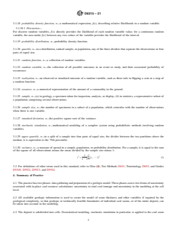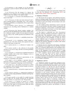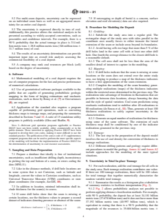 SIGNIFICANCE AND USE 5.1 Traditional methods for expressing geological uncertainty consist of preparing reliability categories based simply on the distance between drill hole data points, such as the one described by Wood et al. (5) that uses only the drill holes within the coal bed. A major drawback of distance methods is their weak to null association with estimation errors. This practice provides a methodology for effectively assessing the uncertainty in coal resource estimates utilizing stochastic simulation. In determining uncertainty for any coal assessment, stochastic simulation enables consideration of other important factors and information beyond the geometry of drill hole locations, both in and out of the coal bed, including: non-depositional channels, depth of weathering, complexity of seam boundaries, coal seam subcrop projections, and varying coal bed geology for different seams due to fluctuating peat depositional environments. Olea et al. (6) explains in detail the methodology behind this practice and illustrates it with an example. 5.2 For multi-seam deposits, uncertainty can be expressed on an individual seam basis as well as an aggregated uncertainty for an entire coal deposit. 5.3 The uncertainty is expressed directly in tons of coal. Additionally, this practice allows the statistical analysis to be presented according to widely-accepted conventions, such as percentiles and confidence intervals. For example, there is a 90 % probability that the actual tonnage in place is 314 million metric tons ± 28.8 million metric tons (346 million tons ± 31.7 million tons) of coal. 5.4 The results of an uncertainty determination can provide important input into an overall risk analysis assessing the commercial feasibility of a coal deposit. 5.5 A company may rank coal resources per block (cell) based on the degree of uncertainty. SCOPE 1.1 This practice covers a procedure for quantitatively determining in-place tonnage uncertainty in a coal resource assessment. The practice uses a database on coal occurrence and applies geostatistical methods to model the uncertainty associated with a tonnage estimated for one or more coal seams. The practice includes instruction for the preparation of results in graphical form. 1.2 This document does not include a detailed presentation of the basic theory behind the formulation of the standard, which can be found in numerous publications, with a selection being given in the references (1-3).2 1.3 This practice should be used in conjunction with professional judgment of the many unique aspects of a coal deposit. 1.4 Units—The values stated in SI units are to be regarded as standard. The values given in parentheses after SI units are provided for information only and are not considered standard. Note 1: All values given in parentheses after SI units are stated in inch-pound units. 1.5 This standard does not purport to address all of the safety concerns, if any, associated with its use. It is the responsibility of the user of this standard to establish appropriate safety, health, and environmental practices and determine the applicability of regulatory limitations prior to use. 1.6 This international standard was developed in accordance with internationally recognized principles on standardization established in the Decision on Principles for the Development of International Standards, Guides and Recommendations issued by the World Trade Organization Technical Barriers to Trade (TBT) Committee.