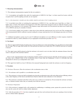 ASTM E596-22 is a standard published by ASTM International. Its full title is "Standard Test Method for Laboratory Measurement of Noise Reduction of Sound-Isolating Enclosures". This standard covers: SIGNIFICANCE AND USE 5.1 The noise reduction of an enclosure is a property of the enclosure, the location of the sound source used to measure noise reduction, and the space in which the enclosure is placed. It is not a property of the enclosure alone, and its measurement under different conditions can be expected to give different results. When the noise reduction is measured in accordance with this test method, the sound source is outside the enclosure and the sound field outside the enclosure approximates a diffuse sound field. Measurements made in accordance with this test method can be expected to be reproducible from one laboratory to another. 5.2 The noise reduction measured in accordance with this test method may be used for the following purposes: 5.2.1 To rank the order of sound-isolating enclosures according to noise isolation class, NIC. 5.2.2 To estimate the highest one-third octave band sound pressure levels that can occur outside the enclosure without exceeding specified sound pressure levels inside the enclosure. 5.2.3 To estimate the one-third octave band sound pressure levels that will occur inside the enclosure with specified sound pressure levels outside. 5.3 The noise reduction measured in accordance with this test method may not estimate accurately the isolation that the enclosure will provide when it is used to isolate a noise source inside it from the space outside. The user should be cautious when using noise reductions measured by this test method to evaluate enclosures used to enclose noise sources. 5.4 Sound-isolating enclosures are frequently made from prefabricated modular panels. The noise reduction measured by this test method applies to the complete enclosure and not to individual panels from which it is made and cannot be used to infer the sound transmission loss of the individual panels. 5.5 Specifications for sound-isolating enclosures may include reference to noise reduction and noise isolation class measured in accordance with th... SCOPE 1.1 This test method covers the reverberation room measurement of the noise reduction of sound-isolating enclosures. 1.2 The noise isolation class may be determined from the noise reduction measured in accordance with this test method. 1.3 This standard does not purport to address all of the safety concerns, if any, associated with its use. It is the responsibility of the user of this standard to establish appropriate safety, health, and environmental practices and determine the applicability of regulatory limitations prior to use. 1.4 This international standard was developed in accordance with internationally recognized principles on standardization established in the Decision on Principles for the Development of International Standards, Guides and Recommendations issued by the World Trade Organization Technical Barriers to Trade (TBT) Committee.