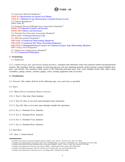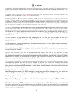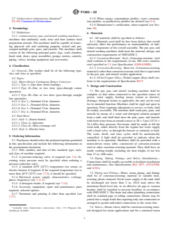 ABSTRACT This specification covers manually fed, motor-driven rotary conveyor type, automatically controlled, commercial pot, pan, and utensil washing machines. The washer shall be of the following type, and class as specified. Motor-driven continuous rotary conveyor: type I - one door (front loading); type II - one or two door (pass-through corner operation); and type III - one or two door (pass-through straight line operation). Style and class: style 1 - steam heated; style 2 - electric heat; class A - injection; and class B - heat exchange coil. The design, construction, and performance requirements of the washing machine are presented in details. The operational test; leakage test; and energy and productivity test shall be performed to meet the requirements prescribed. SCOPE 1.1 This specification covers manually fed, motor-driven rotary conveyor type, automatically controlled, commercial pot, pan, and utensil washing machines, hereinafter referred to as “the washer.” 1.2 The values stated in inch-pound units are to be regarded as standard. The values given in parentheses are mathematical conversions to SI units that are provided for information only and are not considered standard. 1.3 The following precautionary statement pertains only to the test methods portion, Section 9, of this specification: This standard does not purport to address all of the safety concerns, if any, associated with its use. It is the responsibility of the user of this standard to establish appropriate safety, health, and environmental practices and determine the applicability of regulatory limitations prior to use. 1.4 This international standard was developed in accordance with internationally recognized principles on standardization established in the Decision on Principles for the Development of International Standards, Guides and Recommendations issued by the World Trade Organization Technical Barriers to Trade (TBT) Committee.