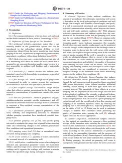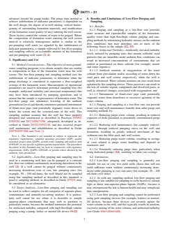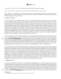 SIGNIFICANCE AND USE 5.1 Method Considerations—The objective of most groundwater sampling programs is to obtain samples that are similar in composition to that of the formation water near the well screen. The low-flow purging and sampling method uses the stabilization of indicator parameters to determine when the pump discharge is considered to represent a flow-weighted average of the formation water. Measurements of operational parameters are used to determine potential sampling bias (for example, artifactual turbidity and increased temperature) that may have been introduced by pumping operations and to ensure that the sample is representative of formation water. The low-flow purge rate minimizes lowering of the ambient groundwater level and thereby minimizes potential entrainment of blank-riser pipe (and potentially stagnant) water above or below the screen into the screened-zone of the well. This sampling method assumes that the well has been properly designed and constructed as described in Practices D5092/D5092M and D6725/D6725M, adequately developed as described in Guide D5521/D5521M, and has received proper well maintenance and rehabilitation as described in Guide D5978/D5978M (see Note 1). Note 1: This Standard is not intended to replace or supersede any regulatory requirements, standard operating procedure (SOP), quality assurance project plan (QAPP), ground water sampling and analysis plan (GWSAP) or site-specific regulatory permit requirements. The procedures described in this Standard may be used in conjunction with regulatory requirements, SOPs, QAPPs, GWSAPs or permits where allowed by the authority with jurisdiction. 5.2 Applicability—Low-flow purging and sampling may be used in a monitoring well that can be pumped at a constant low-flow rate without continuously increasing drawdown in the well (2). If a well cannot be purged without continuously increasing drawdown even at very low pumping rates (for example, 50 – 100 mL/min), the well should not be sampled using th... SCOPE 1.1 This practice describes the method of low-flow purging and sampling used to collect groundwater samples from wells to assess groundwater quality. 1.2 The purpose of this procedure is to collect groundwater samples that represent a flow-weighted average of solute and colloid concentrations transported through the formation near the well screen under ambient conditions. Samples collected using this method can be analyzed for groundwater contaminants and/or naturally occurring analytes. 1.3 This practice is generally not suitable for use in wells with very low-yields and cannot be conducted using grab sampling or inertial lift devices. This practice is not suitable for use in wells with non-aqueous phase liquids. 1.4 Units—The values stated in SI units are to be regarded as standard. The values given in parentheses are approximate mathematical conversions to inch-pound units that are provided for information only and are not considered standard. 1.5 This practice offers a set of instructions for performing one or more specific operations. This document cannot replace education or experience and should be used in conjunction with professional judgment. Not all aspects of this practice may be applicable in all circumstances. This ASTM standard is not intended to represent or replace the standard of care by which the adequacy of a given professional service must be judged, nor should this document be applied without consideration of a project's many unique aspects. The word “standard” in the title means only that the document has been approved through the ASTM consensus process. 1.6 This standard does not purport to address all of the safety concerns, if any, associated with its use. It is the responsibility of the user of this standard to establish appropriate safety, health, and environmental practices and determine the applicability of regulatory limitations prior to use. 1.7 This international standar...