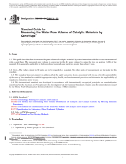 SIGNIFICANCE AND USE 5.1 This guide provides an alternative way to measure the porosity of catalytic materials without the use of mercury porosimetry. It is useful for research and development as well as quality control purposes. (See Test Methods D4284 and D6761.) SCOPE 1.1 This guide describes how to measure the pore volume of catalytic materials by water immersion with the excess water removed with a centrifuge. The measured pore volume is converted to the dry pore volume by using the loss on ignition (LOI) of the material. It is generally applicable to both powdered materials and particles greater than about 1 mm. 1.2 Units—The values stated in SI units are to be regarded as standard. No other units of measurement are included in this standard. 1.3 This standard does not purport to address all of the safety concerns, if any, associated with its use. It is the responsibility of the user of this standard to establish appropriate safety, health, and environmental practices and determine the applicability of regulatory limitations prior to use. 1.4 This international standard was developed in accordance with internationally recognized principles on standardization established in the Decision on Principles for the Development of International Standards, Guides and Recommendations issued by the World Trade Organization Technical Barriers to Trade (TBT) Committee.