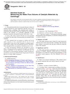 ASTM D8413-22 is a guide published by ASTM International. Its full title is "Standard Guide for Measuring the Water Pore Volume of Catalytic Materials by Centrifuge". This standard covers: SIGNIFICANCE AND USE 5.1 This guide provides an alternative way to measure the porosity of catalytic materials without the use of mercury porosimetry. It is useful for research and development as well as quality control purposes. (See Test Methods D4284 and D6761.) SCOPE 1.1 This guide describes how to measure the pore volume of catalytic materials by water immersion with the excess water removed with a centrifuge. The measured pore volume is converted to the dry pore volume by using the loss on ignition (LOI) of the material. It is generally applicable to both powdered materials and particles greater than about 1 mm. 1.2 Units—The values stated in SI units are to be regarded as standard. No other units of measurement are included in this standard. 1.3 This standard does not purport to address all of the safety concerns, if any, associated with its use. It is the responsibility of the user of this standard to establish appropriate safety, health, and environmental practices and determine the applicability of regulatory limitations prior to use. 1.4 This international standard was developed in accordance with internationally recognized principles on standardization established in the Decision on Principles for the Development of International Standards, Guides and Recommendations issued by the World Trade Organization Technical Barriers to Trade (TBT) Committee.