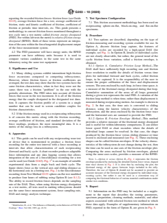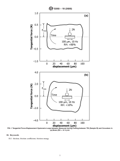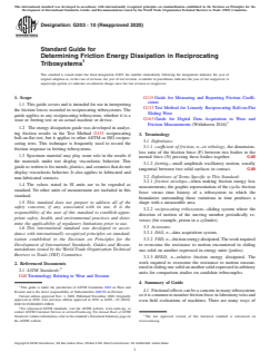 SIGNIFICANCE AND USE 5.1 Many sliding systems exhibit intermittent high friction force excursions compared to competing tribosystems. However, where friction forces or friction coefficients are averaged, the test data may show that the two systems have the same friction characteristics, when in fact they were not the same; there was a friction “problem” in the one with the periodic aberrations. The FED takes into account all friction forces that occur in the test increment. It is all of the friction energy that the couple dissipated in the designated test duration. It captures the friction profile of a system in a single number that can be used to screen candidate couples for friction characteristics. 5.2 If the friction energy used in a reciprocating tribosystem is of concern this metric along with the friction recording, average coefficient of friction, and standard deviation of the force readings, produces the most meaningful data. It is a metric of the energy loss in a tribosystem. SCOPE 1.1 This guide covers and is intended for use in interpreting the friction forces recorded in reciprocating tribosystems. The guide applies to any reciprocating tribosystem, whether it is a wear or fretting test or an actual machine or device. 1.2 The energy dissipation guide was developed in analyzing friction results in the Test Method G133 reciprocating ball-on-flat test, but it applies to other ASTM or ISO reciprocating tests. This technique is frequently used to record the friction response in fretting tribosystems. 1.3 Specimen material may play some role in the results if the materials under test display viscoelastic behavior. This guide as written is for metals, plastics, and ceramics that do not display viscoelastic behavior. It also applies to lubricated and non-lubricated contacts. 1.4 The values stated in SI units are to be regarded as standard. No other units of measurement are included in this standard. 1.5 This standard does not purport to address all of the safety concerns, if any, associated with its use. It is the responsibility of the user of this standard to establish appropriate safety, health, and environmental practices and determine the applicability of regulatory limitations prior to use. 1.6 This international standard was developed in accordance with internationally recognized principles on standardization established in the Decision on Principles for the Development of International Standards, Guides and Recommendations issued by the World Trade Organization Technical Barriers to Trade (TBT) Committee.