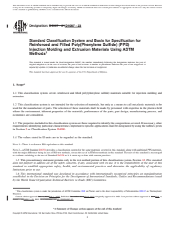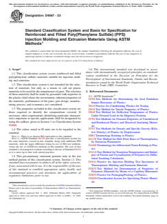 ABSTRACT This classification system covers reinforced and filled poly(phenylene sulfide) (PPS) materials suitable for injection molding and extrusion. This classification system is not intended for the selection of materials, but only as a means to call out plastic materials to be used for the manufacture of parts. The physical properties of the materials must meet the required tensile strength, flexural modulus, Izod impact strength, flexural strength, and density. SCOPE 1.1 This classification system covers reinforced and filled poly(phenylene sulfide) materials suitable for injection molding and extrusion. 1.2 This classification system is not intended for the selection of materials, but only as a means to call out plastic materials to be used for the manufacture of parts. The selection of these materials shall be made by personnel with expertise in the plastics field where the environment, inherent properties of the materials, performance of the parts, part design, manufacturing process, and economics are considered. 1.3 The properties included in this classification system are those required to identify the compositions covered. If necessary, other requirements identifying particular characteristics important to specific applications shall be designated by using the suffixes given in Section 5 or Classification System D4000. 1.4 The values stated in SI units are to be regarded as the standard. Note 1: There is no known ISO equivalent to this standard. Note 2: ASTM Standard D6358 provides a classification system for the same materials covered in this standard, along with additional PPS materials, with the major difference being its use of ISO test methods, versus the use of ASTM test methods in this standard. The user of this standard is encouraged to evaluate switching to the use of Standard D6358 as it is more up to date with current practices. 1.5 This precautionary statement pertains only to the test method portion of this classification system, Section 12. This standard does not purport to address all of the safety concerns, if any, associated with its use. It is the responsibility of the user of this standard to establish appropriate safety, health, and environmental practices and determine the applicability of regulatory limitations prior to use. 1.6 This international standard was developed in accordance with internationally recognized principles on standardization established in the Decision on Principles for the Development of International Standards, Guides and Recommendations issued by the World Trade Organization Technical Barriers to Trade (TBT) Committee.