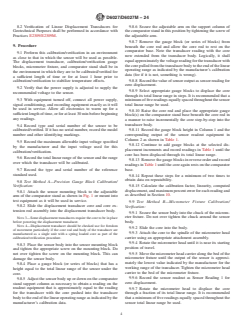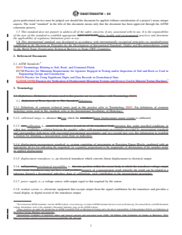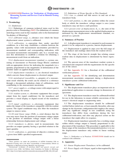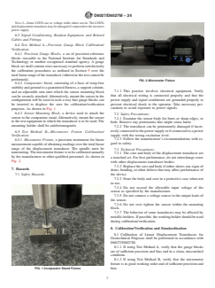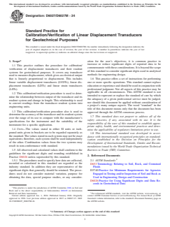 SIGNIFICANCE AND USE 5.1 The displacement transducer plays an important role in geotechnical applications to measure change in dimensions of specimens. 5.2 The displacement transducer must be calibrated/verified for use in the laboratory to ensure reliable conversions of the sensor's electrical output to engineering units. 5.3 The displacement transducer should be calibrated/verified before initial use, at least annually thereafter, after any change in the electronic configuration that employs the sensor, after any significant change in test conditions using the transducer that differ from conditions during the last calibration/verification, and after any physical action on the transducer that might affect its response. 5.4 Displacement transducer generally has a working range within which voltage output is linearly proportional to displacement of the transducer. This procedure is applicable to the linear range of the transducer. Recommended practice is to use the displacement transducer only within its linear working range. Note 1: Verification as in Practices E2309/E2309M should not be confused with calibration SCOPE 1.1 This practice outlines the procedure for calibration/verification of displacement transducers and their readout systems for geotechnical purposes. It covers any transducer used to measure displacement, which gives an electrical output that is linearly proportional to displacement. This includes linear variable displacement transducers (LVDTs), linear displacement transducers (LDTs) and linear strain transducers (LSTs). 1.2 This calibration/verification procedure is used to determine the relationship between output of the transducer and its readout system and change in length. This relationship is used to convert readings from the transducer readout system into engineering units. 1.3 This calibration/verification procedure also is used to determine the accuracy of the transducer and its readout system over the range of its use to compare with the manufacturer’s specifications for the instrument and the suitability of the instrument for a specific application. 1.4 Units—The values stated in either SI units or inch-pound units given in brackets are to be regarded separately as the standard. The values stated in each system may not be exact equivalents; therefore, each system shall be used independently of the other. Combination values from the two systems may result in non-conformance with standard. 1.5 All observed and calculated values shall conform to the guidelines for significant digits and rounding established in Practice D6026 unless superseded by this standard. 1.5.1 The procedures used to specify how data are collected, recorded or calculated in this standard are regarded as the industry standard. In addition they are representative of the significant digits that generally should be retained. The procedures used do not consider material variation, purpose for obtaining the data, special purpose studies, or any consideration for the user’s objectives; it is common practice to increase or reduce significant digits of reported data to be commensurate with these considerations. It is beyond the scope of this standard to consider significant digits used in analytical methods for engineering design. 1.6 This practice offers a set of instructions for performing one or more specific operations. This standard cannot replace education or experience and should be used in conjunction with professional judgment. Not all aspects of this practice may be applicable in all circumstances. This ASTM standard is not intended to represent or replace the standard of care by which the adequacy of a given professional service must be judged, nor should this document be applied without consideration of a project’s many unique aspects. The word “standard” in the title of this document means only that the document has been approved through the ASTM consensus process. 1.7 This standa...
