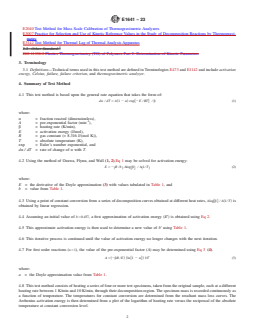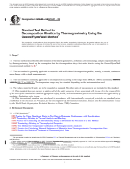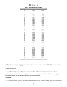 SIGNIFICANCE AND USE 5.1 Thermogravimetry provides a rapid method for determining the temperature-decomposition profile of a material. 5.2 This test method can be used for estimating lifetimes of materials, using Practice E1877 provided that a relationship has been established between the thermal endurance test results and actual lifetime tests. SCOPE 1.1 This test method describes the determination of the kinetic parameters, Arrhenius activation energy, and pre-exponential factor by thermogravimetry, based on the assumption that the decomposition obeys first-order kinetics using the Ozawa/Flynn/Wall isoconversional method (1, 2).2 1.2 This test method is generally applicable to materials with well-defined decomposition profiles, namely, a smooth, continuous mass change with a single maximum rate. 1.3 This test method is normally applicable to decomposition occurring in the range from 400 K to 1300 K (nominally 100 °C to 1000 °C). The temperature range may be extended depending on the instrumentation used. 1.4 The values stated in SI units are to be regarded as standard. No other units of measurement are included in this standard. 1.5 This standard does not purport to address all of the safety concerns, if any, associated with its use. It is the responsibility of the user of this standard to establish appropriate safety, health, and environmental practices and determine the applicability of regulatory limitations prior to use. 1.6 This international standard was developed in accordance with internationally recognized principles on standardization established in the Decision on Principles for the Development of International Standards, Guides and Recommendations issued by the World Trade Organization Technical Barriers to Trade (TBT) Committee.