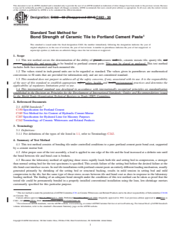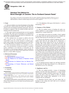 SIGNIFICANCE AND USE 5.1 This test method provides a means of determining whether or not tile of the types indicated in 1.1 can be bonded with adequate strength to portland cement paste. Tile specifications can refer to this test method in order to establish minimum bond strength limits appropriate to the service conditions that are anticipated. 5.2 Separation between bond coat and setting bed, or breakage of the setting bed itself shall not be considered failures of tile bond. SCOPE 1.1 This test method covers the determination of the ability of ceramic tile, ceramic mosaic tile, quarry tile, porcelain tile, and paver tile to be bonded to portland cement paste. Tiles may be glazed or unglazed. This test method includes both face-mounted and back-mounted tile. 1.2 The values stated in inch-pound units are to be regarded as standard. The values given in parentheses are mathematical conversions to SI units that are provided for information only and are not considered standard. 1.3 This standard does not purport to address all of the safety concerns, if any, associated with its use. It is the responsibility of the user of this standard to establish appropriate safety, health, and environmental practices and determine the applicability of regulatory limitations prior to use. 1.4 This international standard was developed in accordance with internationally recognized principles on standardization established in the Decision on Principles for the Development of International Standards, Guides and Recommendations issued by the World Trade Organization Technical Barriers to Trade (TBT) Committee.