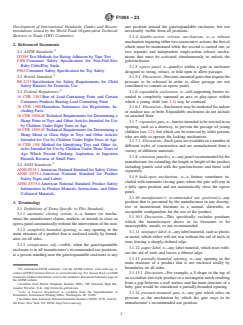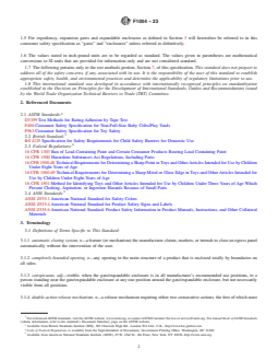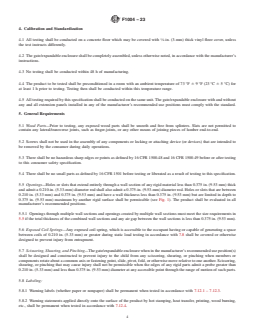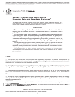 ASTM F1004-23 is a technical specification published by ASTM International. Its full title is "Standard Consumer Safety Specification for Expansion Gates and Expandable Enclosures". This standard covers: SCOPE 1.1 This consumer safety specification covers minimum safety performance requirements, test methods, and requirements for labeling and instructional material to minimize hazards to young children resulting from the normal use and reasonably foreseeable misuse and abuse of expansion gates and expandable enclosures. 1.2 Products known as expansion gates and expandable enclosures, or by any other name, which are in the scope of this consumer safety specification are intended for young children aged six months through 24 months, and are defined in Section 3. 1.3 Expansion gates and expandable enclosures defined in Section 3 are for domestic use and are not to be confused with other types of gates or enclosures that may be specifically designed for commercial, institutional, agricultural, pet use, or any other such use. 1.4 No expansion gate or expandable enclosure as defined in Section 3, that is, produced after the approval date of this consumer safety specification either by label or other means, shall indicate compliance with this specification unless it conforms to all the requirements contained herein. 1.5 For expediency, expansion gates and expandable enclosures as defined in Section 3 will heretofore be referred to in this consumer safety specification as “gates” and “enclosures” unless referred to definitively. 1.6 The values stated in inch-pound units are to be regarded as standard. The values given in parentheses are mathematical conversions to SI units that are provided for information only and are not considered standard. 1.7 The following pertains only to the test methods portion, Section 7, of this specification. This standard does not purport to address all of the safety concerns, if any, associated with its use. It is the responsibility of the user of this standard to establish appropriate safety, health, and environmental practices and determine the applicability of regulatory limitations prior to use. 1.8 This international standard was developed in accordance with internationally recognized principles on standardization established in the Decision on Principles for the Development of International Standards, Guides and Recommendations issued by the World Trade Organization Technical Barriers to Trade (TBT) Committee.