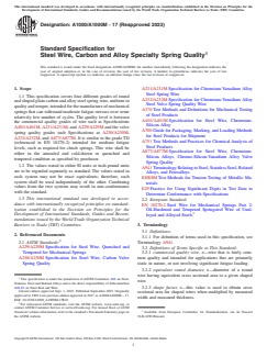 ASTM A1000/A1000M-17(2023) is a technical specification published by ASTM International. Its full title is "Standard Specification for Steel Wire, Carbon and Alloy Specialty Spring Quality". This standard covers: ABSTRACT This specification covers round, shaped and flat rolled plain carbon and alloy steel spring wires, uniform in quality and temper, intended for the manufacture of mechanical springs that can withstand moderate fatigue stresses over some relatively low number of cycles. This wire shall be either in the annealed and cold-drawn or oil-tempered conditions. The steel may be made by any commercially accepted steel making process in either ingot cast or strand cast form. The percentage of the following elements: carbon, manganese, phosphorus, sulfur, silicon, chromium, and vanadium, shall conform to the chemical composition requirements and be determined by heat analysis. Tensile and wrap tests shall conform to the mechanical requirements such as tensile strength. Metallurgical requirements including eddy current testing for etched surface, decarburization, and inclusion content are detailed. SCOPE 1.1 This specification covers four different grades of round and shaped plain carbon and alloy steel spring wire, uniform in quality and temper, intended for the manufacture of mechanical springs that can withstand moderate fatigue stresses over some relatively low number of cycles. The quality level is between the commercial quality grades of wire such as Specifications A401/A401M, A231/A231M, and A229/A229M and the valve spring quality grades such Specifications as A230/A230M, A232/A232M, and A877/A877M. It is similar to the grade TD (referenced in EN 10270-2) intended for medium fatigue levels, such as required for clutch springs. This wire shall be either in the annealed and cold-drawn or quenched and tempered condition as specified by purchaser. 1.2 The values stated in either SI units or inch-pound units are to be regarded separately as standard. The values stated in each system may not be exact equivalents; therefore, each system shall be used independently of the other. Combining values from the two systems may result in non-conformance with the standard. 1.3 This international standard was developed in accordance with internationally recognized principles on standardization established in the Decision on Principles for the Development of International Standards, Guides and Recommendations issued by the World Trade Organization Technical Barriers to Trade (TBT) Committee.
