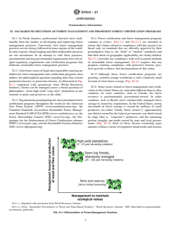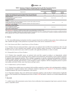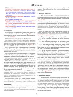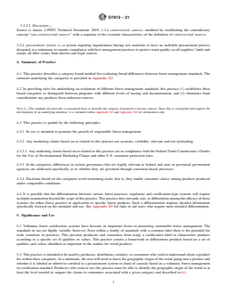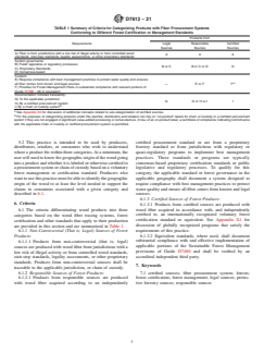 SIGNIFICANCE AND USE 5.1 Voluntary forest certification systems have become an important factor in promoting sustainable forest management. The standards in use are highly variable, however. Even within a family of standards with a common label there is the potential for wide variations in practices. This prevents producers and consumers from using a certification label to characterize products according to a specific set of qualities or values. This practice creates a framework to differentiate products based on a set of qualities and values identified as important in the market for wood products. (A) See Appendix X3 for discussion of additional concepts related to sub-categorization of certified sources.(B) For the purposes of categorizing products under this practice, distributors and retailers can rely on “on-product” labels for chain of custody or a certified procurement system if they are not engaged in significant value-added processing or remanufacture. In lieu of an on‐product label, a certificate of compliance indicating conformance with the applicable chain of custody or certified procurement system is permitted. 5.2 This practice is intended to be used by producers, distributors, retailers, or consumers who wish to understand where a product fits within three categories. At a minimum, the user will need to know the geographic origin of the wood going into a product and whether it is labeled or otherwise certified to a procurement system or chain of custody based on a voluntary forest management or certification standard. Producers who want to use this practice must be able to identify the geographic origin of the wood to at least the level needed to support the claims to consumers associated with a given category and described in 6.1. SCOPE 1.1 This practice sets forth minimum criteria and evaluation requirements for products employing the use of different systems to trace wood fiber to sources operating under different forest management or forest certification systems. 1.2 The purpose of this practice is to provide wood products manufacturers, distributors, and retailers with a system to provide clear, objective information to communicate to consumers regarding product conformance to different wood fiber tracing systems within specific forest management or forest certification programs. It provides a structure that segregates the different types of labels and tracing systems in use among major forest certification standards and other voluntary and regulatory standards governing the production of forest products. Note 1: The principles in this practice apply internationally, provided that the required information is available to support categorization. For example, products certified to the globally recognized forest certification standards will meet the “Certified Sources” category regardless of their origin, and documented risk assessments (noted in Appendix X5) provide the basis upon which raw materials sourced from Canada and the United States can be deemed to meet the “Legal Sources” category. To categorize raw materials sourced outside of Canada and the United States as “Legal Sources,” it is recommended that the adopting entity develop supplemental provisions to address country-specific issues as needed. 1.2.1 This practice provides an objective basis to differentiate among: 1.2.1.1 Non-controversial (that is, legal) sources of forest products, 1.2.1.2 Responsible sources of forest products (that is, non-controversial sources together with certified procurement systems or from forests managed using responsible practices), and 1.2.1.3 Certified sources of forest products (that is, non-controversial sources together with certified chain of custody). 1.2.2 This practice is intended to provide a framework to help wood product vendors identify the competent and reliable evidence needed to substantiate product claims as required by the U.S. Federal Trade Commission’s Guides for ...