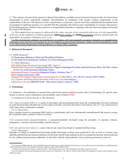 ASTM D7612-21 is a standard published by ASTM International. Its full title is "Standard Practice for Categorizing Wood and Wood-Based Products According to Their Fiber Sources". This standard covers: SIGNIFICANCE AND USE 5.1 Voluntary forest certification systems have become an important factor in promoting sustainable forest management. The standards in use are highly variable, however. Even within a family of standards with a common label there is the potential for wide variations in practices. This prevents producers and consumers from using a certification label to characterize products according to a specific set of qualities or values. This practice creates a framework to differentiate products based on a set of qualities and values identified as important in the market for wood products. (A) See Appendix X3 for discussion of additional concepts related to sub-categorization of certified sources.(B) For the purposes of categorizing products under this practice, distributors and retailers can rely on “on-product” labels for chain of custody or a certified procurement system if they are not engaged in significant value-added processing or remanufacture. In lieu of an on‐product label, a certificate of compliance indicating conformance with the applicable chain of custody or certified procurement system is permitted. 5.2 This practice is intended to be used by producers, distributors, retailers, or consumers who wish to understand where a product fits within three categories. At a minimum, the user will need to know the geographic origin of the wood going into a product and whether it is labeled or otherwise certified to a procurement system or chain of custody based on a voluntary forest management or certification standard. Producers who want to use this practice must be able to identify the geographic origin of the wood to at least the level needed to support the claims to consumers associated with a given category and described in 6.1. SCOPE 1.1 This practice sets forth minimum criteria and evaluation requirements for products employing the use of different systems to trace wood fiber to sources operating under different forest management or forest certification systems. 1.2 The purpose of this practice is to provide wood products manufacturers, distributors, and retailers with a system to provide clear, objective information to communicate to consumers regarding product conformance to different wood fiber tracing systems within specific forest management or forest certification programs. It provides a structure that segregates the different types of labels and tracing systems in use among major forest certification standards and other voluntary and regulatory standards governing the production of forest products. Note 1: The principles in this practice apply internationally, provided that the required information is available to support categorization. For example, products certified to the globally recognized forest certification standards will meet the “Certified Sources” category regardless of their origin, and documented risk assessments (noted in Appendix X5) provide the basis upon which raw materials sourced from Canada and the United States can be deemed to meet the “Legal Sources” category. To categorize raw materials sourced outside of Canada and the United States as “Legal Sources,” it is recommended that the adopting entity develop supplemental provisions to address country-specific issues as needed. 1.2.1 This practice provides an objective basis to differentiate among: 1.2.1.1 Non-controversial (that is, legal) sources of forest products, 1.2.1.2 Responsible sources of forest products (that is, non-controversial sources together with certified procurement systems or from forests managed using responsible practices), and 1.2.1.3 Certified sources of forest products (that is, non-controversial sources together with certified chain of custody). 1.2.2 This practice is intended to provide a framework to help wood product vendors identify the competent and reliable evidence needed to substantiate product claims as required by the U.S. Federal Trade Commission’s Guides for ...