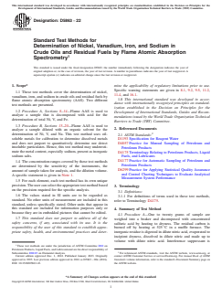 SIGNIFICANCE AND USE 5.1 When fuels are combusted, metals present in the fuels can form low melting compounds that are corrosive to metal parts. Metals present at trace levels in petroleum can deactivate catalysts during processing. These test methods provide a means of quantitatively determining the concentrations of vanadium, nickel, iron, and sodium. Thus, these test methods can be used to aid in determining the quality and value of the crude oil and residual oil. SCOPE 1.1 These test methods cover the determination of nickel, vanadium, iron, and sodium in crude oils and residual fuels by flame atomic absorption spectrometry (AAS). Two different test methods are presented. 1.2 Procedure A, Sections 8–14—Flame AAS is used to analyze a sample that is decomposed with acid for the determination of total Ni, V, and Fe. 1.3 Procedure B, Sections 15–20—Flame AAS is used to analyze a sample diluted with an organic solvent for the determination of Ni, V, and Na. This test method uses oil-soluble metals for calibration to determine dissolved metals and does not purport to quantitatively determine nor detect insoluble particulates. Hence, this test method may underestimate the metal content, especially sodium, present as inorganic sodium salts. 1.4 The concentration ranges covered by these test methods are determined by the sensitivity of the instruments, the amount of sample taken for analysis, and the dilution volume. A specific statement is given in Note 1. 1.5 For each element, each test method has its own unique precision. The user can select the appropriate test method based on the precision required for the specific analysis. 1.6 The values stated in SI units are to be regarded as standard. No other units of measurement are included in this standard, unless specifically stated. Other units that appear in this standard are included for information purposes only or because they are in embedded pictures that cannot be edited. 1.7 This standard does not purport to address all of the safety concerns, if any, associated with its use. It is the responsibility of the user of this standard to establish appropriate safety, health, and environmental practices and determine the applicability of regulatory limitations prior to use. Specific warning statements are given in 8.1, 9.2, 9.5, 11.2, 11.4, and 16.1. 1.8 This international standard was developed in accordance with internationally recognized principles on standardization established in the Decision on Principles for the Development of International Standards, Guides and Recommendations issued by the World Trade Organization Technical Barriers to Trade (TBT) Committee.