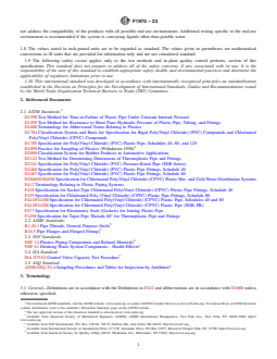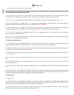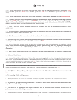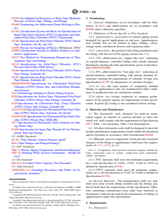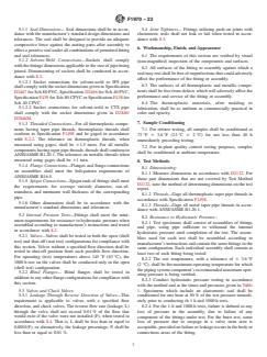 ABSTRACT This specification covers special engineered fittings, appurtenances or valves for use in poly(vinyl chloride) or chlorinated poly(vinyl chloride) pipe and tubing systems. Fittings or appurtenances covered by this specification are generally either molded, fabricated, or assembled from molded or machined components. The materials used in components include rigid thermoplastics, thermoplastic elastomers, elastomerics, and metals. Seal dimensions shall be in accordance with the standard design dimensions and tolerances and shall be designed in such a manner as to provide adequate compressive force against mating parts after assembly. Solvent-weld, threaded, flange, and spigot connections shall also meet the requirements for bolt patterns, average outside diameter, out-of-plane roundness, and minimum wall thickness of the corresponding pipe. Hydrostatic internal pressure tests shall be performed on valves, check valves, and blind flanges to verify compliance with hydrostatic pressure resistance, leakage resistance, joint tightness, and activation pressure requirements. SCOPE 1.1 This specification covers fittings, appurtenances and valves which are to be used with pipe and tubing complying with Specifications D1785, D2241, D2846/D2846M, F441/F441M or F442/F442M, or other piping as specified by the fittings manufacturer. These products, such as unions, flanges or valves, are not included in the scope of existing ASTM specifications. This specification includes minimum requirements for testing, materials, dimensions, workmanship, marking, and in-plant quality control. 1.2 Fittings or appurtenances covered by this specification are generally either molded, fabricated, or assembled from molded or machined components. The materials used in components include rigid thermoplastics, thermoplastic elastomers, elastomerics, and metals. The body or main portion of the fitting, appurtenance or valve is typically PVC, CPVC, PE or PA (nylon). All products covered by this standard are intended to be used in PVC or CPVC plastic piping systems, or as a transition from these to metal systems. 1.3 The application of these products to gas service is beyond the scope of this specification. 1.4 The products covered by this specification are intended for use with the distribution of pressurized liquids only, which are chemically compatible with the piping materials. Due to inherent hazards associated with testing components and systems with compressed air or other compressed gases some manufacturers do not allow pneumatic testing of their products. Consult with specific product/component manufacturers for their specific testing procedures prior to pneumatic testing. Note 1: Warning: Pressurized (compressed) air or other compressed gases contain large amounts of stored energy which present serious safety which present serious safety hazards should a system fail for any reason. 1.5 Fittings which rely on heat fusion welding for connection to the piping system are outside the scope of this specification. 1.6 Check valves (including foot valves) covered by this specification shall not be considered backflow prevention devices and shall not be used for the protection of a potable water supply. For definitions and requirements of backflow prevention devices, consult model plumbing codes and ASSE.2 1.7 Due to the complex and installation-specific concerns surrounding chemical resistance and corrosion, this specification does not address the compatibility of the products with all possible end-use environments. Additional testing specific to the end-use environment is recommended if the system is conveying liquids other than potable water. 1.8 The values stated in inch-pound units are to be regarded as standard. The values given in parentheses are mathematical conversions to SI units that are provided for information only and are not considered standard. 1.9 The following safety caveat applies only to the test ...