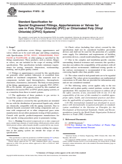ASTM F1970-23 is a technical specification published by ASTM International. Its full title is "Standard Specification for Special Engineered Fittings, Appurtenances or Valves for use in Poly (Vinyl Chloride) (PVC) or Chlorinated Poly (Vinyl Chloride) (CPVC) Systems". This standard covers: ABSTRACT This specification covers special engineered fittings, appurtenances or valves for use in poly(vinyl chloride) or chlorinated poly(vinyl chloride) pipe and tubing systems. Fittings or appurtenances covered by this specification are generally either molded, fabricated, or assembled from molded or machined components. The materials used in components include rigid thermoplastics, thermoplastic elastomers, elastomerics, and metals. Seal dimensions shall be in accordance with the standard design dimensions and tolerances and shall be designed in such a manner as to provide adequate compressive force against mating parts after assembly. Solvent-weld, threaded, flange, and spigot connections shall also meet the requirements for bolt patterns, average outside diameter, out-of-plane roundness, and minimum wall thickness of the corresponding pipe. Hydrostatic internal pressure tests shall be performed on valves, check valves, and blind flanges to verify compliance with hydrostatic pressure resistance, leakage resistance, joint tightness, and activation pressure requirements. SCOPE 1.1 This specification covers fittings, appurtenances and valves which are to be used with pipe and tubing complying with Specifications D1785, D2241, D2846/D2846M, F441/F441M or F442/F442M, or other piping as specified by the fittings manufacturer. These products, such as unions, flanges or valves, are not included in the scope of existing ASTM specifications. This specification includes minimum requirements for testing, materials, dimensions, workmanship, marking, and in-plant quality control. 1.2 Fittings or appurtenances covered by this specification are generally either molded, fabricated, or assembled from molded or machined components. The materials used in components include rigid thermoplastics, thermoplastic elastomers, elastomerics, and metals. The body or main portion of the fitting, appurtenance or valve is typically PVC, CPVC, PE or PA (nylon). All products covered by this standard are intended to be used in PVC or CPVC plastic piping systems, or as a transition from these to metal systems. 1.3 The application of these products to gas service is beyond the scope of this specification. 1.4 The products covered by this specification are intended for use with the distribution of pressurized liquids only, which are chemically compatible with the piping materials. Due to inherent hazards associated with testing components and systems with compressed air or other compressed gases some manufacturers do not allow pneumatic testing of their products. Consult with specific product/component manufacturers for their specific testing procedures prior to pneumatic testing. Note 1: Warning: Pressurized (compressed) air or other compressed gases contain large amounts of stored energy which present serious safety which present serious safety hazards should a system fail for any reason. 1.5 Fittings which rely on heat fusion welding for connection to the piping system are outside the scope of this specification. 1.6 Check valves (including foot valves) covered by this specification shall not be considered backflow prevention devices and shall not be used for the protection of a potable water supply. For definitions and requirements of backflow prevention devices, consult model plumbing codes and ASSE.2 1.7 Due to the complex and installation-specific concerns surrounding chemical resistance and corrosion, this specification does not address the compatibility of the products with all possible end-use environments. Additional testing specific to the end-use environment is recommended if the system is conveying liquids other than potable water. 1.8 The values stated in inch-pound units are to be regarded as standard. The values given in parentheses are mathematical conversions to SI units that are provided for information only and are not considered standard. 1.9 The following safety caveat applies only to the test ...