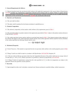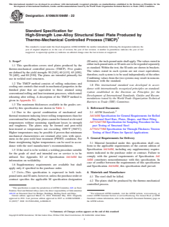 ABSTRACT This specification covers high-strength low-alloy structural steel plates that were produced by the thermo-mechanical controlled process (TMCP). This method consists of rolling reductions and cooling rate controls, which result in mechanical properties in the finished plate that are equivalent to those attained using conventional rolling and heat treatment processes. SCOPE 1.1 This specification covers steel plates produced by the thermo-mechanical controlled process (TMCP). Five grades are defined by the yield strength: 50 [345], 60 [415], 65 [450], 70 [485], and 80 [550]. The plates are intended primarily for use in welded steel structures. 1.2 The TMCP method consists of rolling reductions and cooling rate controls that result in mechanical properties in the finished plate that are equivalent to those attained using conventional rolling and heat treatment processes, which entail reheating after rolling. A description of the TMCP method is given in Appendix X1. 1.3 The maximum thicknesses available in the grades covered by this specification are shown in Table 1. 1.4 Due to the special combination of mechanical and thermal treatment inducing lower rolling temperatures than for conventional hot rolling the plates cannot be formed at elevated temperatures without sustaining significant losses in strength and toughness. The plates may be formed and post-weld heat-treated at temperatures not exceeding 1050°F [560°C]. Higher temperatures may be possible if proven that minimum mechanical characteristics are retained after tests with specimens in the post-weld heat treatment (PWHT) condition. For flame straightening higher temperatures can be used in accordance with the steel manufacturer’s recommendations. 1.5 If the steel is to be welded, a welding procedure suitable for the grade of steel and intended use or service is to be utilized. See Appendix X3 of Specification A6/A6M for information on weldability. 1.6 Supplementary requirements are available but shall apply only if specified in the purchase order. 1.7 Units—This specification is expressed in both inch-pound units and SI units; however, unless the purchase order or contract specifies the applicable M specification designation (SI units), the inch-pound units shall apply. The values stated in either inch-pound units or SI units are to be regarded separately as standard. Within the text, the SI units are shown in brackets. The values stated in each system are not exact equivalents; therefore, each system is to be used independently of the other. Combining values from the two systems may result in nonconformances with the standard. 1.8 This international standard was developed in accordance with internationally recognized principles on standardization established in the Decision on Principles for the Development of International Standards, Guides and Recommendations issued by the World Trade Organization Technical Barriers to Trade (TBT) Committee.