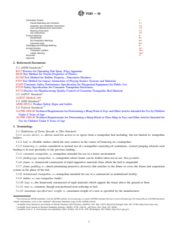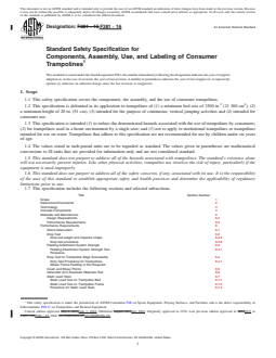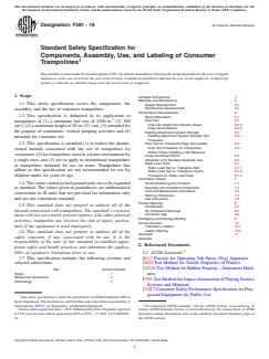 ASTM F381-16: Standard Safety Specification for Components, Assembly, Use, and Labeling of Consumer Trampolines establishes safety requirements to minimize risks for users of consumer trampolines intended for home environments. Published by ASTM International, this standard focuses on design, construction, installation, labeling, and instructional information to reduce the demonstrated hazards associated with trampoline use. This specification is not intended for institutional trampolines or trampolines designed for water use. Compliance with ASTM F381-16 ensures trampolines are safer and come with clear warnings and guidance for consumers.