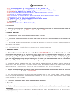 SIGNIFICANCE AND USE 5.1 Other standards are used to collect the gross sample: Practice D2234/D2234M allows for one division of the gross sample before crushing. The mass and top size of the gross or divided sample collected by using these guides and practices are usually too large for chemical or physical testing. Practice D2013/D2013M provides instructions for reducing and dividing the gross or divided sample, by on-line or off-line processes, or both, to a top size and mass suitable to the performance of testing. Any bias in the gross or divided sample before adherence to this practice will remain in the final sample resulting from use of this practice. Therefore, carefully select the standard to be used to collect the gross sample. 5.2 Division and reduction of a sample may occur at more than one location. Most often, the sample is collected, reduced, and divided (one or more times) by use of a mechanical sampling system. The remaining sample may be further divided on-site to facilitate transporting it to the laboratory where further reduction and division likely occurs before analysis. 5.3 In places, this practice requires air drying the sample before subsequent reduction. Procedures for air drying and air-dry loss determination are provided in Test Method D3302/D3302M. 5.4 Most often, samples are reduced and divided to an analysis sample. However, some tests may require a sample of different mass or top size. This procedure may be used to provide a sample of any mass and size consist from the gross or divided sample to, and including, the analysis sample. 5.5 This practice also specifies how to prepare composite samples, if required. SCOPE 1.1 This practice2 covers the reduction and division of gross or divided samples, and the preparation of composite samples, up to and including the individual portions for laboratory analysis. 1.2 Reduction and division procedures are prescribed for coals of the following groups: 1.2.1 Group A includes coals that have been cleaned in all sizes. 1.2.2 Group B includes all other coals. Unknown coals are to be considered under Group B. 1.2.3 Group A allows smaller weight laboratory samples to be retained than Group B. These lower weights may be used for particular coals if they have been shown, by using the procedures of A1.2, to give a sample preparation and analysis variance which is no more than 20 % of the total analysis variance. 1.3 Units—The values stated in either SI units or inch-pound units are to be regarded separately as standard. The values stated in each system are not necessarily exact equivalents; therefore, to ensure conformance with the standard, each system shall be used independently of the other, and values from the two systems shall not be combined. 1.4 This standard does not purport to address all of the safety concerns, if any, associated with its use. It is the responsibility of the user of this standard to establish appropriate safety, health, and environmental practices and determine the applicability of regulatory limitations prior to use. 1.5 This international standard was developed in accordance with internationally recognized principles on standardization established in the Decision on Principles for the Development of International Standards, Guides and Recommendations issued by the World Trade Organization Technical Barriers to Trade (TBT) Committee.