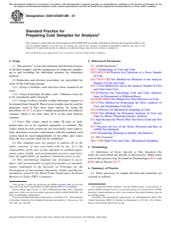 ASTM D2013/D2013M-21 is a standard published by ASTM International. Its full title is "Standard Practice for Preparing Coal Samples for Analysis". This standard covers: SIGNIFICANCE AND USE 5.1 Other standards are used to collect the gross sample: Practice D2234/D2234M allows for one division of the gross sample before crushing. The mass and top size of the gross or divided sample collected by using these guides and practices are usually too large for chemical or physical testing. Practice D2013/D2013M provides instructions for reducing and dividing the gross or divided sample, by on-line or off-line processes, or both, to a top size and mass suitable to the performance of testing. Any bias in the gross or divided sample before adherence to this practice will remain in the final sample resulting from use of this practice. Therefore, carefully select the standard to be used to collect the gross sample. 5.2 Division and reduction of a sample may occur at more than one location. Most often, the sample is collected, reduced, and divided (one or more times) by use of a mechanical sampling system. The remaining sample may be further divided on-site to facilitate transporting it to the laboratory where further reduction and division likely occurs before analysis. 5.3 In places, this practice requires air drying the sample before subsequent reduction. Procedures for air drying and air-dry loss determination are provided in Test Method D3302/D3302M. 5.4 Most often, samples are reduced and divided to an analysis sample. However, some tests may require a sample of different mass or top size. This procedure may be used to provide a sample of any mass and size consist from the gross or divided sample to, and including, the analysis sample. 5.5 This practice also specifies how to prepare composite samples, if required. SCOPE 1.1 This practice2 covers the reduction and division of gross or divided samples, and the preparation of composite samples, up to and including the individual portions for laboratory analysis. 1.2 Reduction and division procedures are prescribed for coals of the following groups: 1.2.1 Group A includes coals that have been cleaned in all sizes. 1.2.2 Group B includes all other coals. Unknown coals are to be considered under Group B. 1.2.3 Group A allows smaller weight laboratory samples to be retained than Group B. These lower weights may be used for particular coals if they have been shown, by using the procedures of A1.2, to give a sample preparation and analysis variance which is no more than 20 % of the total analysis variance. 1.3 Units—The values stated in either SI units or inch-pound units are to be regarded separately as standard. The values stated in each system are not necessarily exact equivalents; therefore, to ensure conformance with the standard, each system shall be used independently of the other, and values from the two systems shall not be combined. 1.4 This standard does not purport to address all of the safety concerns, if any, associated with its use. It is the responsibility of the user of this standard to establish appropriate safety, health, and environmental practices and determine the applicability of regulatory limitations prior to use. 1.5 This international standard was developed in accordance with internationally recognized principles on standardization established in the Decision on Principles for the Development of International Standards, Guides and Recommendations issued by the World Trade Organization Technical Barriers to Trade (TBT) Committee.