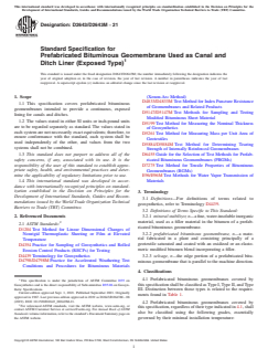 ASTM D2643/D2643M-21 is a technical specification published by ASTM International. Its full title is "Standard Specification for Prefabricated Bituminous Geomembrane Used as Canal and Ditch Liner (Exposed Type)". This standard covers: ABSTRACT This specification covers prefabricated asphalt liner sheets intended for installation to provide a continuous, exposed lining for reservoirs, ponds, canals, and ditches. The liner sheets shall consist of layers of asphalt mastic between asphalt-saturated felts, mats, or fabrics, and shall be coated on both sides and covered with a material to prevent the finished sheets from sticking together during storage and shipment. The coating shall be a hot-applied asphalt material permitted to be compounded with a mineral stabilizer. Thickness of asphalt coating, water absorption, mass percent of asphalt, resistance to decay, flexibility, brittleness, and heat dissipation tests shall be performed to conform to the requirements specified. SCOPE 1.1 This specification covers prefabricated bituminous geomembranes intended to provide a continuous, exposed lining for canals and ditches. 1.2 The values stated in either SI units or inch-pound units are to be regarded separately as standard. The values stated in each system are not necessarily exact equivalents; therefore, to ensure conformance with the standard, each system shall be used independently of the other, and values from the two systems shall not be combined. 1.3 This standard does not purport to address all of the safety concerns, if any, associated with its use. It is the responsibility of the user of this standard to establish appropriate safety, health, and environmental practices and determine the applicability of regulatory limitations prior to use. 1.4 This international standard was developed in accordance with internationally recognized principles on standardization established in the Decision on Principles for the Development of International Standards, Guides and Recommendations issued by the World Trade Organization Technical Barriers to Trade (TBT) Committee.