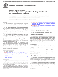 ASTM D2824/D2824M-18(2024) is a standard specification developed by ASTM International for aluminum-pigmented asphalt roof coatings. This standard defines requirements for both nonfibered and fibered roof coatings (excluding asbestos fiber) used on roofing and masonry surfaces. The coatings enhance protection, weather resistance, and solar reflectance for various types of roofs. This specification supports both brush and spray application methods and establishes uniform criteria for composition, performance, and labeling, ensuring consistency and reliability across roofing and waterproofing projects.