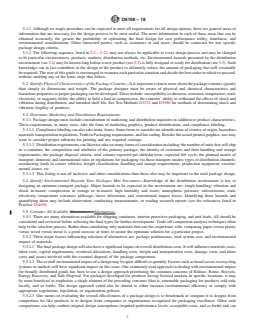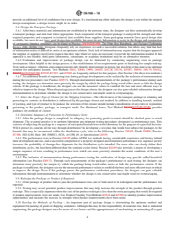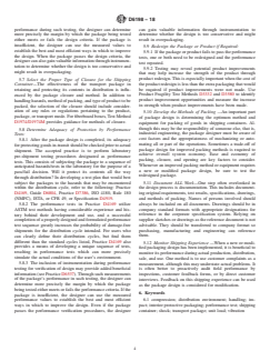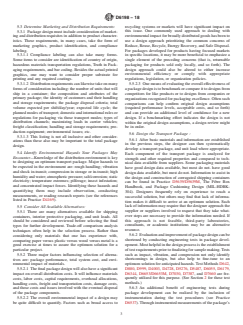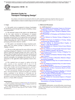 SIGNIFICANCE AND USE 4.1 This guide assists users in design and development of packaging intended for the protection of goods while they are in transit from point of origin to final destination. By following all steps of this guide, users will be assured that the most important factors are included in package design. In some cases, the sequence of steps may be changed, and often the steps may occur simultaneously with concurrent work activities. 4.2 The design process focuses on protection from hazards of handling, storage, and shipping while recognizing the economics of all other facets of distribution, including packaging materials and labor, and transportation. 4.3 In transport packaging, distribution is generally defined as inclusion of handling, storage, and transportation factors. SCOPE 1.1 This guide covers an approach to design of packaging for distributing goods through the hazards of handling, storage, and transportation. 1.2 The principal content of this guide is the identification of the key steps involved in development of transport packages, including shipping containers, interior protective packaging, and unit loads. It is recognized that actual usage and application to individual design projects may vary appreciably without diminishing the value of the process. Consult with a packaging professional whenever needed. 1.3 This guide is not intended for design of primary packaging unless the primary package is planned for use as a shipping container. 1.4 The user of this guide must be aware of the carrier rules regarding packaging for shipment via each mode of transportation in which the transport package may move, such as the National Motor Freight Classification (less-than truckload) and the Uniform Freight Classification (railroad). For hazardous materials packaging, the packaging must perform to the requirements of the applicable modal regulations listed in Section 2. 1.5 This standard does not purport to address all of the safety concerns, if any, associated with its use. It is the responsibility of the user of this standard to establish appropriate safety, health, and environmental practices and determine the applicability of regulatory limitations prior to use. 1.6 This international standard was developed in accordance with internationally recognized principles on standardization established in the Decision on Principles for the Development of International Standards, Guides and Recommendations issued by the World Trade Organization Technical Barriers to Trade (TBT) Committee.