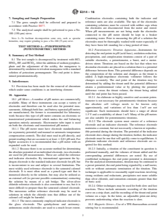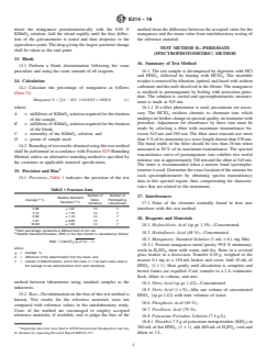 SIGNIFICANCE AND USE 4.1 This test method is intended to be used for compliance with compositional specifications for manganese content in iron ores, concentrates, and agglomerates. It is assumed that all who use these procedures will be trained analysts capable of performing common laboratory procedures skillfully and safely. It is expected that work will be performed in a properly equipped laboratory and that proper waste disposal procedures will be followed. Appropriate quality control practices must be followed such as those described in Guide E882. SCOPE 1.1 These test methods cover the determination of manganese in iron ores, concentrates, and agglomerates. The following two test methods are included: Sections Test Method A (Pyrophosphate (Potentiometric)) 8 – 15 Test Method B (Periodate (Spectrophotometric)) 16 – 22 1.2 Test Method A covers the determination of manganese in the range from 2.5 % to 15.0 %. Test Method B covers the determination of manganese in the range of 0.01 % to 5.00 %. Note 1: The lower limit for this test method is set at 50 % relative error for the lowest grade material tested in the interlaboratory study in accordance with Practice E1601. 1.3 The values stated in SI units are to be regarded as standard. No other units of measurement are included in this standard. 1.4 This standard does not purport to address all of the safety concerns, if any, associated with its use. It is the responsibility of the user of this standard to establish appropriate safety and health practices and determine the applicability of regulatory limitations prior to use.