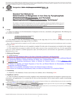 ASTM E314-16 - Standard Test Methods for Determination of Manganese in Iron Ores by Pyrophosphate Potentiometry and Periodate Spectrophotometry Techniques - provides guidance for the accurate quantification of manganese content in iron ores, concentrates, and agglomerates. This standard is essential for ensuring compliance with compositional specifications in iron ore materials, supporting quality control, and enabling consistent product analysis across the mining and metallurgical industries. The document details two analytical approaches: pyrophosphate potentiometry (Test Method A) and periodate spectrophotometry (Test Method B).