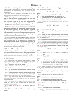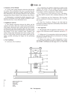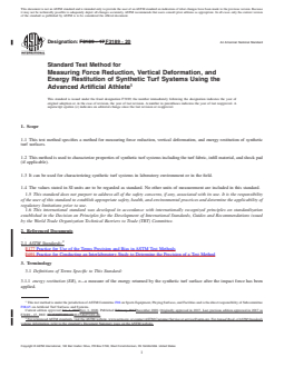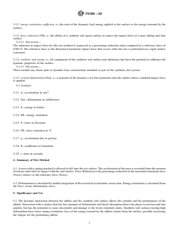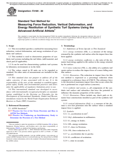 SIGNIFICANCE AND USE 5.1 The dynamic interaction between the athlete and the synthetic turf surface affects the comfort and the performance of the athlete. Interaction with a surface that has low amounts of deformation and shock absorption allows the player to run fast and turn quickly, but has the potential to cause discomfort and damage to the lower extremity joints. Synthetic turf surfaces having high deformation have lower energy restitution. Less of the energy exerted by the athlete returns from the surface, possibly increasing the fatigue for the performing athlete. SCOPE 1.1 This test method specifies a method for measuring force reduction, vertical deformation, and energy restitution of synthetic turf surfaces. 1.2 This method is used to characterize properties of synthetic turf systems including the turf fabric, infill material, and shock pad (if applicable). 1.3 It can be used for characterizing synthetic turf systems in laboratory environment or in the field. 1.4 The values stated in SI units are to be regarded as standard. No other units of measurement are included in this standard. 1.5 This standard does not purport to address all of the safety concerns, if any, associated with its use. It is the responsibility of the user of this standard to establish appropriate safety, health, and environmental practices and determine the applicability of regulatory limitations prior to use. 1.6 This international standard was developed in accordance with internationally recognized principles on standardization established in the Decision on Principles for the Development of International Standards, Guides and Recommendations issued by the World Trade Organization Technical Barriers to Trade (TBT) Committee.