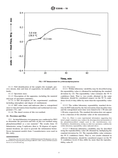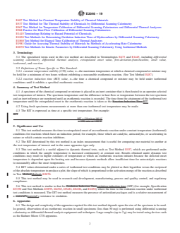 SIGNIFICANCE AND USE 5.1 This test method measures the time to extrapolated onset of an exothermic reaction under constant temperature (isothermal) conditions for reactions which have an induction period, for example, those which are catalytic, autocatalytic, or accelerating in nature or which contain reaction inhibitors. 5.2 The RIT determined by this test method is an index measurement that is useful for comparing one material to another at the test temperature of interest and in the same apparatus type only. 5.3 This test method is a useful adjunct to dynamic thermal tests, such as Test Method E537, which are performed under conditions in which the sample temperature is increased continuously at constant rate. Results obtained under dynamic test conditions may result in higher estimates of temperature at which an exothermic reaction initiates because the detected onset temperature is dependent upon the heating rate and because dynamic methods allow insufficient time for autocatalytic reactions to measurably affect the onset temperature. 5.4 RIT values determined under a series of isothermal test conditions may be plotted as their logarithm versus the reciprocal of the absolute temperature to produce a plot, the slope of which is proportional to the activation energy of the reaction as described in Test Methods E2070. 5.5 This test method may be used in research and development, manufacturing, process and quality control, and regulatory compliance. 5.6 This test method is similar to that for oxidation induction time (OIT) (for example, Specification D3350 and Test Methods D3895, D4565, D5483, D6186, and E1858) where the time to the oxidation reaction under isothermal test conditions is measured. The OIT test method measures the presence of antioxidant packages and is a relative measurement of a material’s resistance to oxidation. SCOPE 1.1 This test method describes the measurement of reaction induction time (RIT) of chemical materials that undergo exothermic reactions with an induction period. The techniques and apparatus described may be used for solids, liquids, or slurries of chemical substances. The temperature range covered by this test method is typically from ambient to 400 °C. This range may be extended depending upon the apparatus used. 1.2 The RIT is a relative index value, not an absolute thermodynamic property. As an index value, the RIT value may change depending upon experimental conditions. A comparison of RIT values may be made only for materials tested under similar conditions of apparatus, specimen size, and so forth. Furthermore, the RIT value may not predict behavior of large quantities of material. 1.3 The RIT shall not be used by itself to establish a safe operating temperature. It may be used in conjunction with other test methods (for example, Test Methods E487 and E537, and Guide E1981) as part of a hazard analysis of a particular operation. 1.4 This test method may be used for RIT values greater than 15 min (as relative imprecision increases at shorter periods). 1.5 This test method is used to study catalytic, autocatalytic, and accelerating reactions. These reactions depend upon time as well as temperature. Such reactions are often studied by fixing one experimental parameter (that is, time or temperature) and then measuring the other parameter (that is, temperature or time). This test method measures time to reaction onset detection under isothermal conditions. It is related to Test Method E487 that measures detected reaction onset temperature under constant time conditions 1.6 The values stated in SI units are to be regarded as standard. No other units of measurement are included in this test method. 1.7 This standard does not purport to address all of the safety concerns, if any, associated with its use. It is the responsibility of the user of this standard to establish appropriate safety, health, and environmental practices and determine the appl...